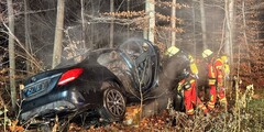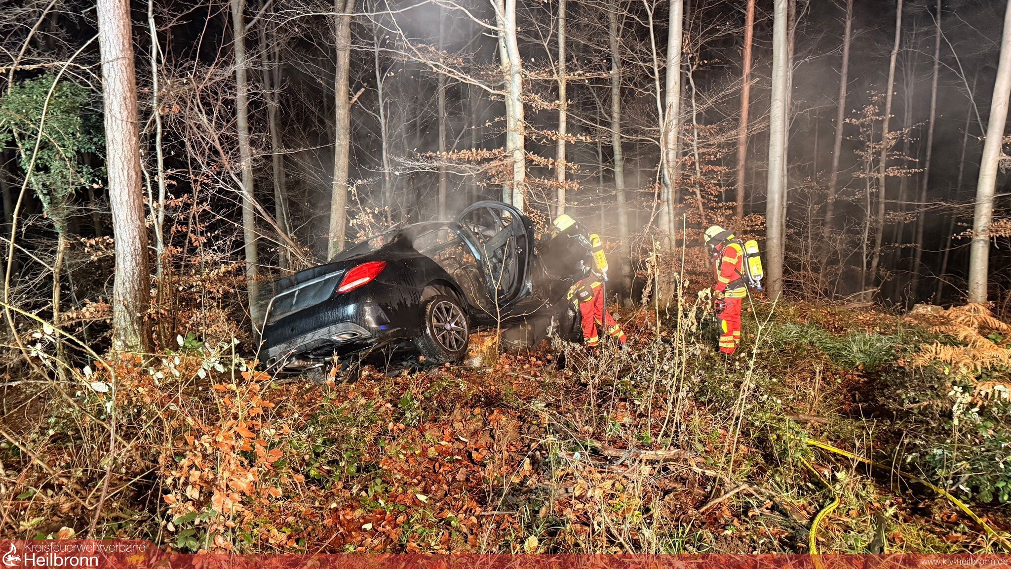Bei einem schweren Verkehrsunfall am Donnerstagabend bei Löwenstein ist ein Mercedes zunächst von der Straße abgekommen und anschließend in Flammen aufgegangen. Der Fahrer konnte sich selbst retten.