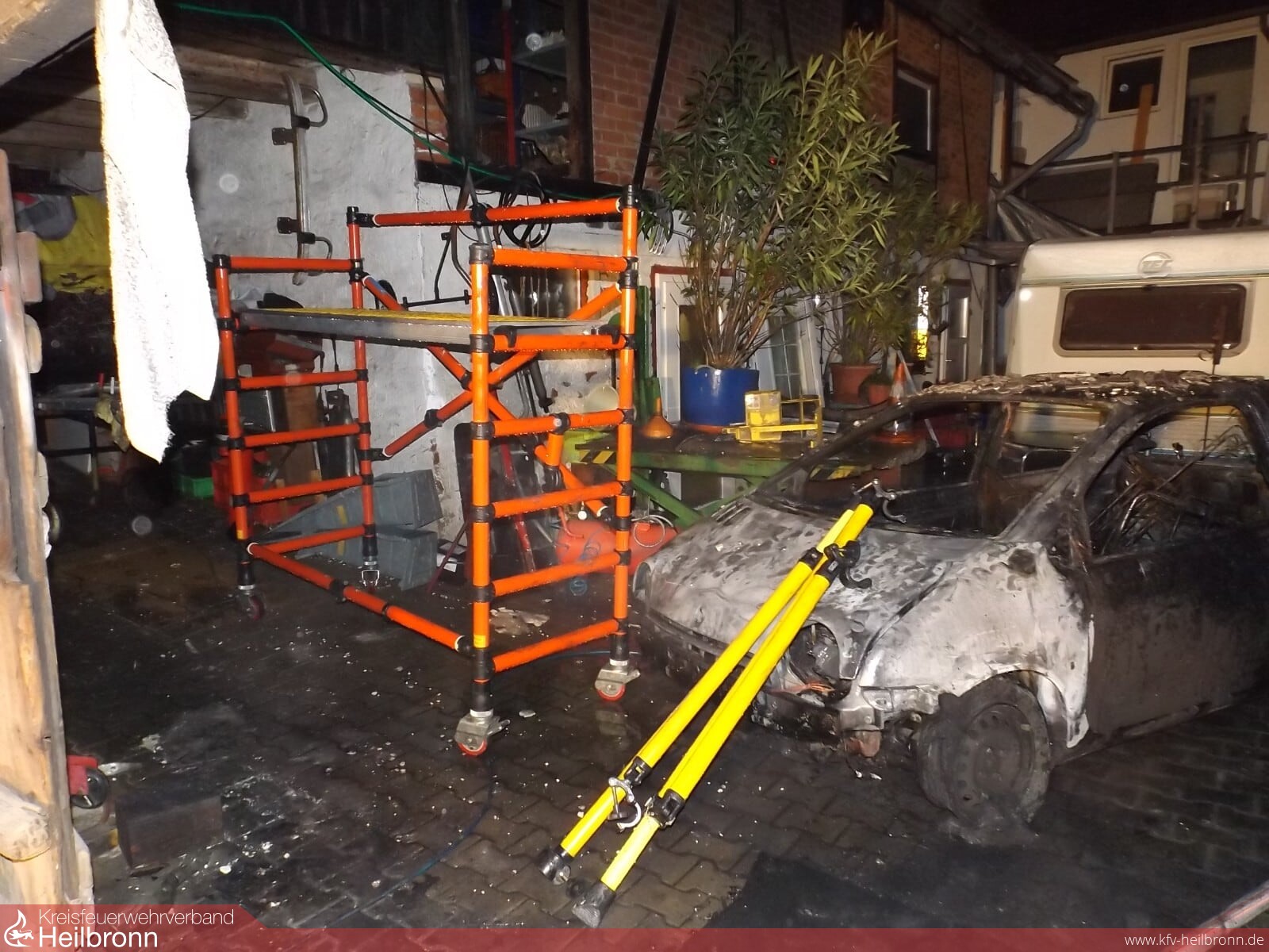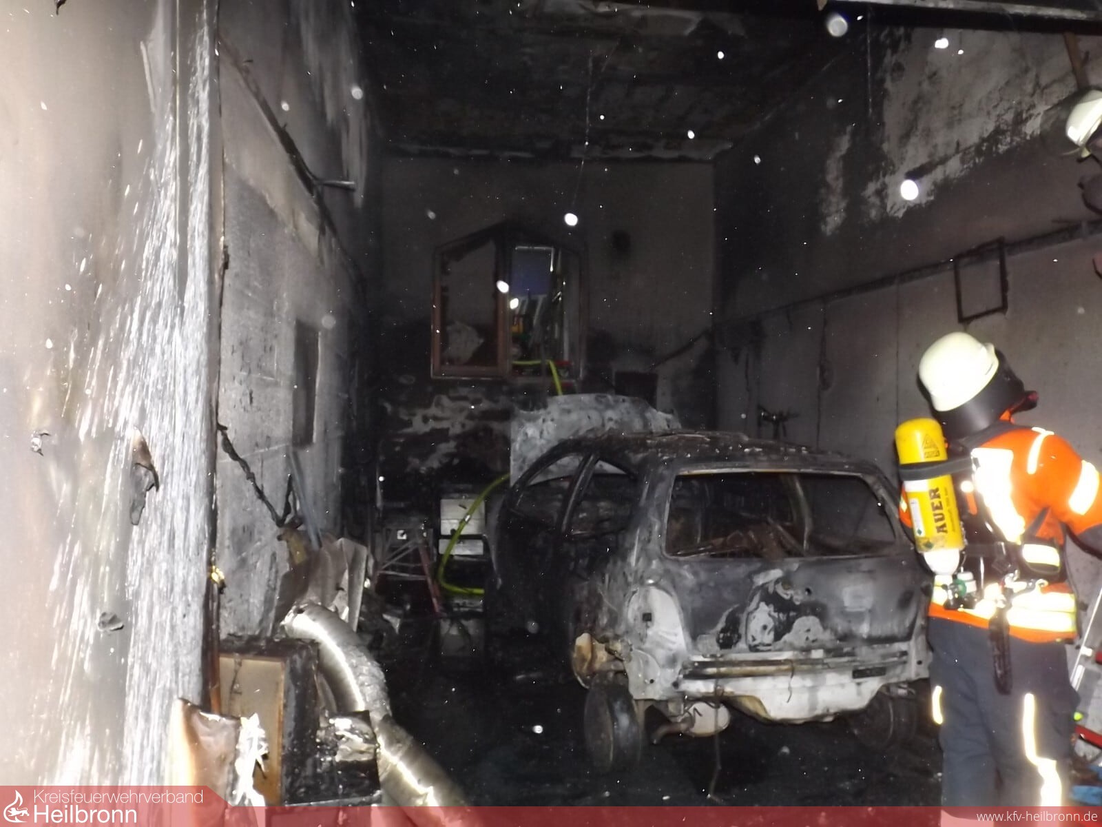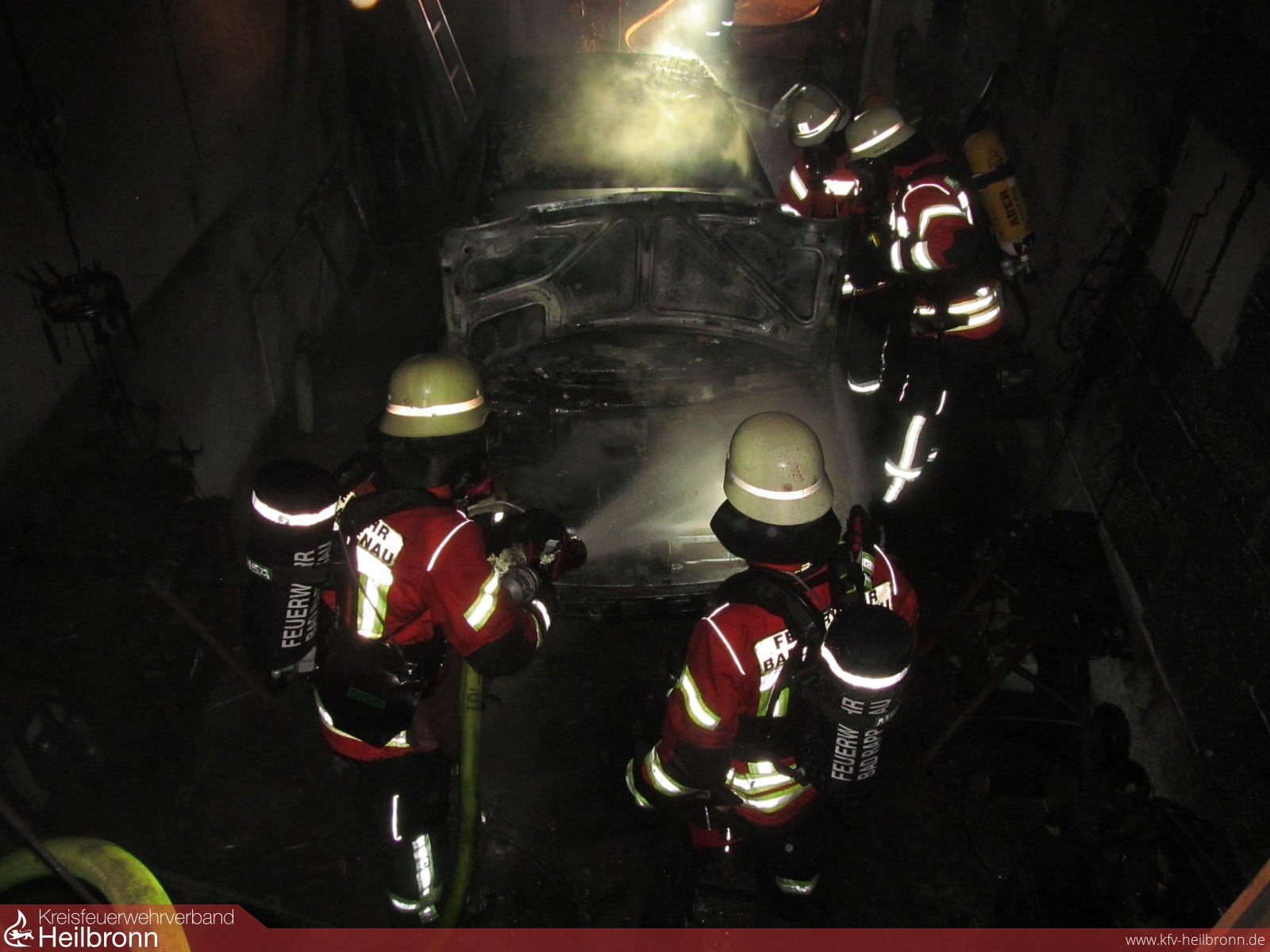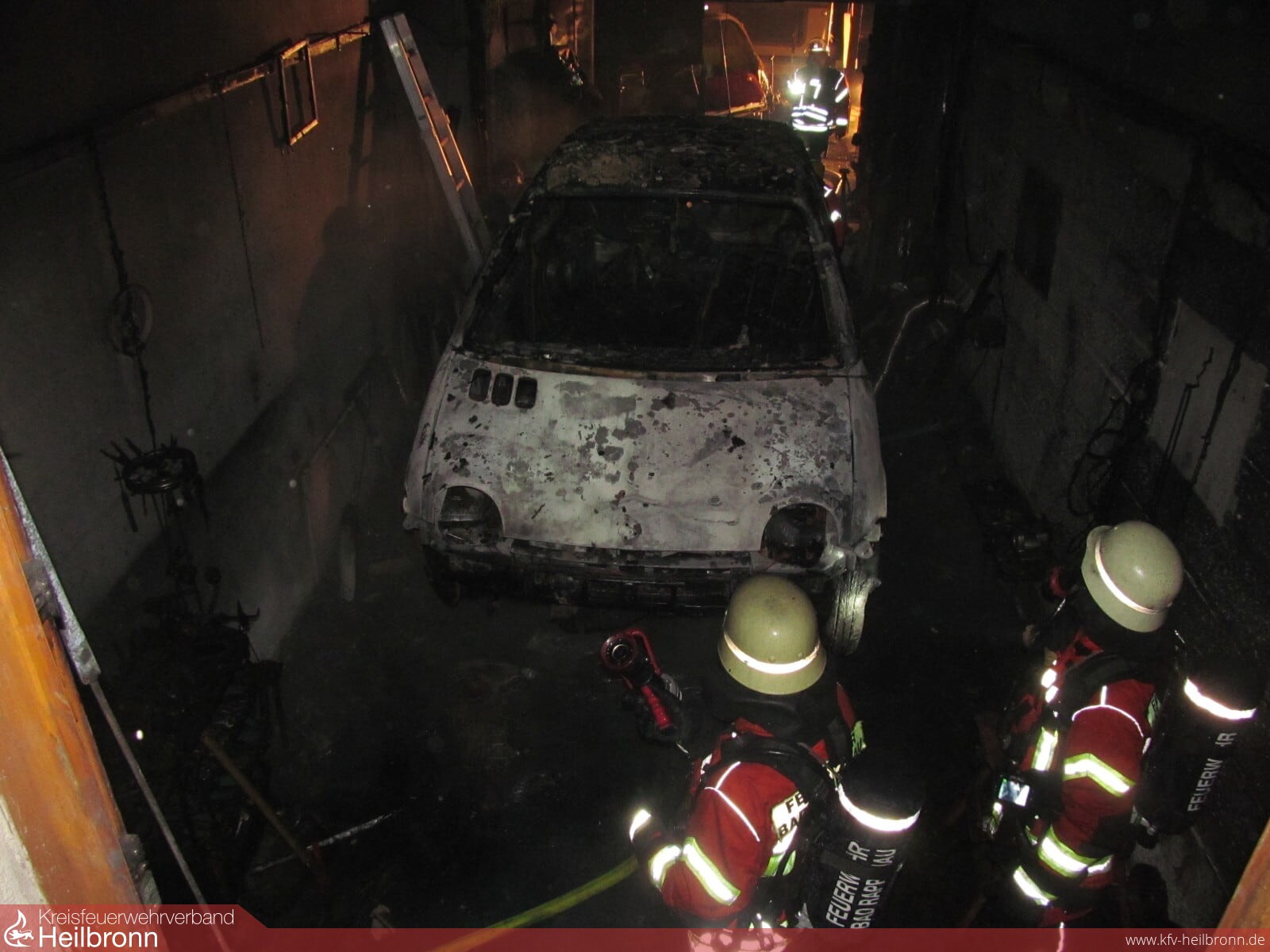 Mit dem Alarmstichwort „Gebäudebrand“ wurden die Abteilungen Bad Rappenau , Heinsheim und Grombach am Samstagmorgen gegen 01:00 Uhr nach Grombach alarmiert. Hier brannte ein Fahrzeug in einer Werkstatt. Das ersteintreffende Löschfahrzeug der Abteilung Grombach begann unverzüglich mit der Brandbekämpfung mit einem Trupp unter Atemschutz. Die nachrückenden Einsatzkräfte aus Bad Rappenau stellten ebenfalls zwei Trupps unter Atemschutz, welche die Brandbekämpfung unterstützten. Gegen 01:40 Uhr war das Feuer aus. Jedoch hatte die Decke eine noch so hohe Temperatur, dass diese von der Feuerwehr geöffnet wurde um Glutnester abzulöschen. Um die Decke besser erreichen zu können, verschob die Feuerwehr den PKW mithilfe von Rangierrollen aus der Scheune. Gegen 04:00 Uhr war der Einsatz beendet. Die Freiwillige Feuerwehr Bad Rappenau war insgesamt mit 7 Fahrzeugen und circa 33 Mann im Einsatz.