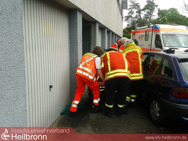 Der Rüstzug der Feuerwehr Bad Friedrichshall wurde gegen 12 Uhr in die Friedrichshallerstraße alarmiert. Aus noch ungeklärter Ursache ist eine ältere Frau mit ihrem PKW von einem öffentlichen Parkplatz eine zirka 1,60 m Höhe Wand auf eine Hofeinfahrt gestützt. Zuvor überfuhr Sie eine zirka 2 Meter hohe Hecke. Das Fahrzeug kam schließlich an einem Garagentor zum stehen. Die Fahrerin war nicht in Ihrem Fahrzeug eingeklemmt, klagte aber über Schmerzen was eine schonende Rettung in Absprache mit dem Rettungsdienst erforderlich machte. Die Patientin wurde unter Einsatz eines KED-Systems sowie einem Rettungsbrett aus ihrem verunfallten Fahrzeug gerettet und dem Rettungsdienst übergeben. Am Fahrzeug selbst, wurde die Batterie abgeklemmt.