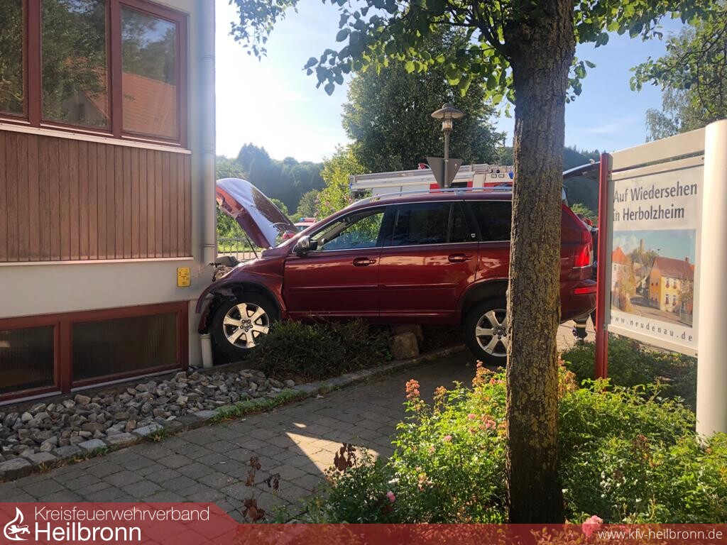 Vor Ort ergab sich folgende Situation: ein PKW-Fahrer fuhr aus unbekannten Gründen nach der Ortseinfahrt von Neudenau her kommend nach rechts auf die Ecke eines Wohngebäudes.