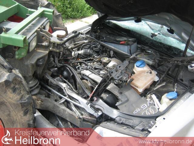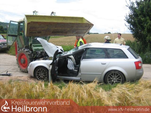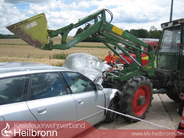 Schwere Verletzungen erlitt ein 45-Jähriger bei einem Unfall am Mittwoch bei Gemmingen-Stebbach. Er fuhr mit seinem Audi auf einem landwirtschaftlichen Weg in Richtung "Hofstelle". An einer Kreuzung missachtete er offensichtlich die Vorfahrt eines von rechts kommenden Traktors, der seinerseits wahrscheinlich zu weit links fuhr. Bei der Kollision rammte die an der Front des Traktors angebaute Schaufel das Dach des PKW. An den Fahrzeugen entstand ein Sachschaden von insgesamt rund 28.000 Euro.