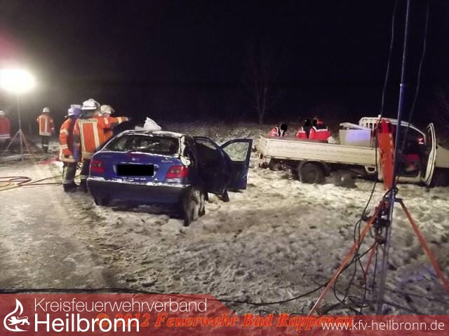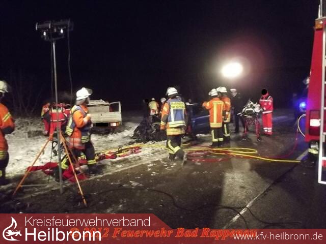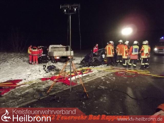 Des Weiteren besteht bei dem 44-jährigen der dringende Verdacht, dass er zum Unfallzeitpunkt unter dem Einfluss von Alkohol gestanden hat. Die Staatsanwaltschaft Heilbronn ordnete deshalb zur Erforschung des Unfalles die Entnahme einer Blutprobe bei dem 44-jährigen an, sowie die Erstellung eines technischen Unfallgutachtens. An den Fahrzeugen entstand ein Sachschaden von 15000 Euro. Einen sogenannten witterungsbedingten Unfall wegen Schneeglätte o. ä. kann die Polizei nach ersten Feststellung ausschließen. Die Landstraße 530 war wegen den Bergungs- und Ermittlungsmaßnahmen bis gg. 22.00 Uhr gesperrt. Die Polizeireviere Neckarsulm und Eppingen waren mit insgesamt 3 Streifen im Einsatz. Die Feuerwehr Bad Rappenau war mit 18 Einsatzkräften vor Ort. Der Rettungsdienst mit 2 Rettungswagen, einem Notarzteinsatzfahrzeug, 1 Notfallnachsorgedienstteam. Zur Betreuung der Angehörigen wurde ein Geistlicher als Notfallseelsorger verständigt.