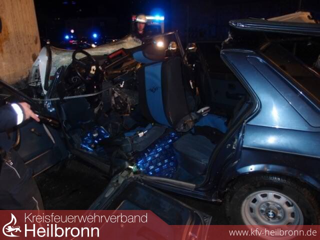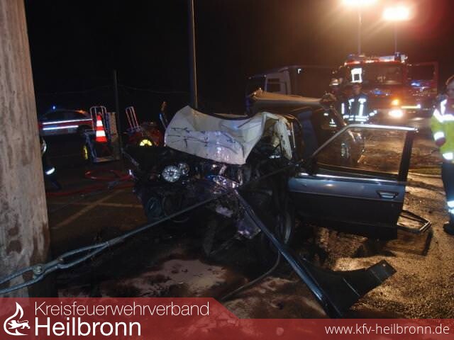 In der Nacht auf Donnerstag wurde die Feuerwehr Neckarsulm zu einem Verkehrsunfall mit eingeklemmter Person in der Kanalstraße alarmiert. Der Fahrer eines PKW war dort mit seinem Fahrzeug gegen den Pfeiler einer Brücke geprallt.