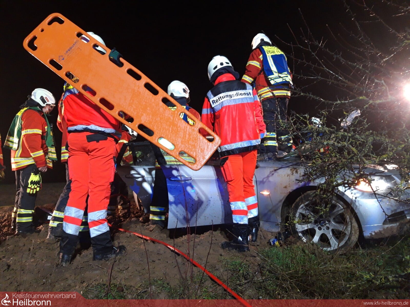 Der Rüstzug der Feuerwehr Bad Friedrichshall wurde mit dem Alarmstichwort „Verkehrsunfall PKW eine Person eingeklemmt“ auf die L1096 alarmiert. Ein aus Richtung Untergriesheim kommender PKW kam kurz nach der Heuchlinger Höhe in Richtung Bad Friedrichshall von der Fahrbahn ab, schleuderte mehrere Meter weit über den Straßenrand und prallte mit der Fahrerseite seitlich gegen einen Baum. Der Fahrer wurde schwer verletzt in seinem Fahrzeug eingeklemmt und musste unter Einsatz von mehreren hydraulischen Rettungsgeräten von der Feuerwehr, in enger Zusammenarbeit mit dem Rettungsdienst und der Notärztin aus dem Fahrzeug befreit werden. Um eine schonende Rettung durchführen zu können, musste das komplette Dach des Unfallfahrzeugs abgenommen werden. Da sich die Unfallstelle auf einem frisch umgepflügten Feld befand, war ein großer Kräfte und Materialeinsatz und eine anschließende Großreinigung der Einsatzmittel nötig. In Absprache mit der Polizei wurde der angefahrene und teilweise umgestürzte Baum zersägt und am Straßenrand gelagert. Nach der Bergung des Fahrzeugs durch ein Abschleppunternehmen, musste vom Tanklöschfahrzeug die komplette Fahrbahn vom Schlamm und Schmutz, welcher Folge des Unfalls war, abgespritzt und gereinigt werden.