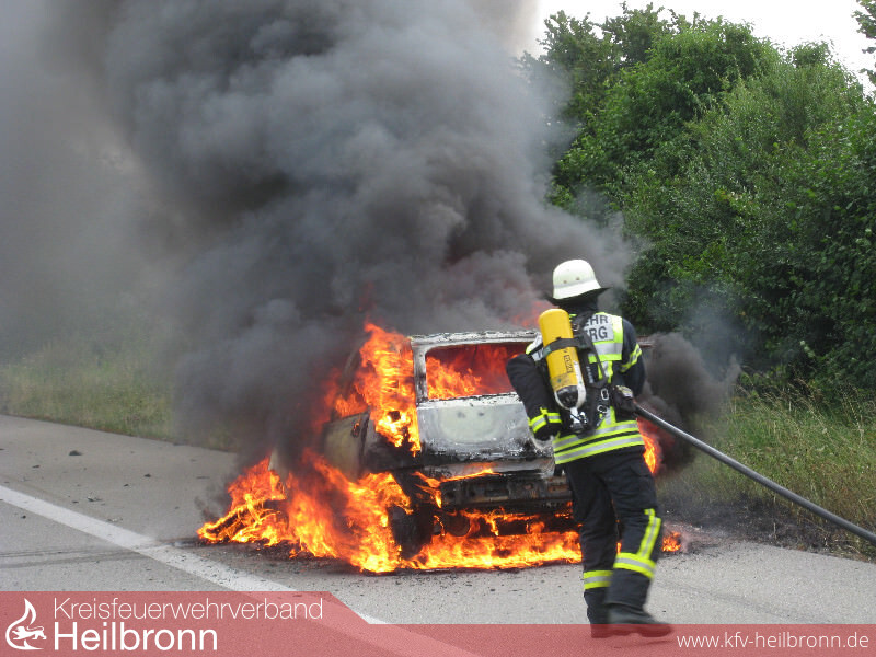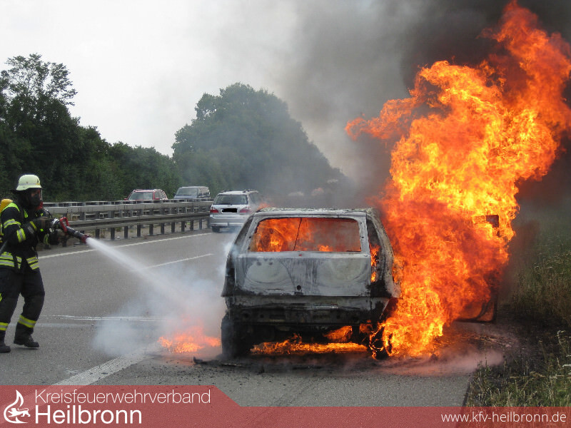 Am Montag, 25.07.2016 wurde die Feuerwehr Weinsberg um 11:59 Uhr zu einem PKW-Brand auf die BAB A6, Fahrtrichtung Nürnberg, gerufen. Durch die derzeit am Autobahnkreuz Weinsberg laufenden Bauarbeiten und der damit verbundenen Staus hatte die ILS neben der Feuerwehr Neckarsulm, die für diesen Streckenabschnitt zuständig ist, vorsorglich auch die Weinsberger Kräfte alarmiert. Beim Eintreffen an der Einsatzstelle, die sich rund 1000 Meter vor der Ausfahrt Bretzfeld befand, stand der PKW auf dem Standstreifen bereits im Vollbrand. Mittels Schnellangriffseinrichtung konnte der Brand rasch unter Kontrolle gebracht werden. Da sich auch der auslaufende Kraftstoff entzündet hatte, setzte man ebenfalls Schaummittel ein. Die Einsatzkräfte aus Neckarsulm unterstützten die Weinsberger Kameraden und stellten u.a. weiteres Löschwasser zur Verfügung. Anschließend konnte die Einsatzstelle der hinzugerufenen Autobahnmeisterei übergeben werden.