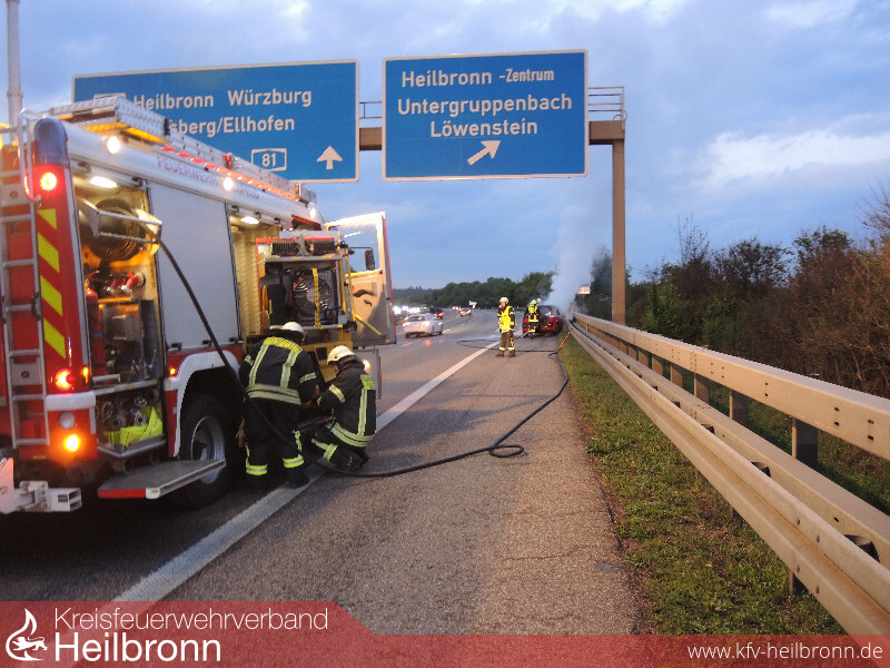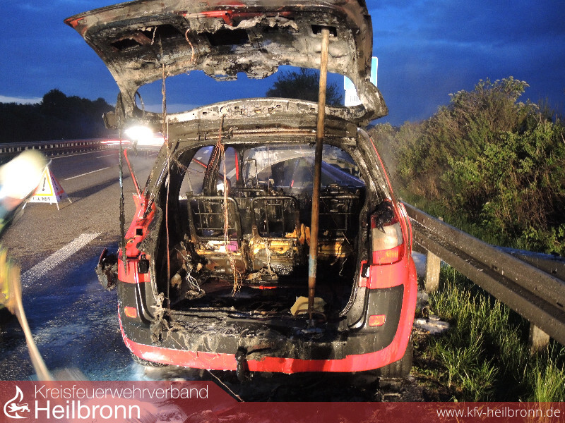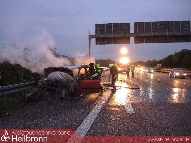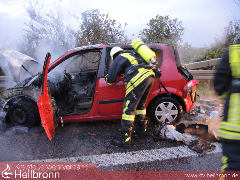 Die Feuerwehr Ilsfeld wurde auf die A81 in Fahrtrichtung Heilbronn mit dem Alarmstichwort PKW-Brand alarmiert. Beim Eintreffen den Feuerwehr stand der Renault kurz vor der Abfahrt Untergruppenbach bereits in Vollbrand. Personen befanden sich zu diesem Zeitpunkt glücklicherweise nicht mehr im Fahrzeug. Das Fahrzeug wurde von zwei Mann unter Atemschutz mit dem Schnellangriff gelöscht. Im späteren Verlauf wurden mit der Wärmebildkamera noch einzelne Glutnester ausfindig gemacht und abgelöscht. Die Feuerwehr sicherte die Unfallstelle noch so lange ab, bis das Fahrzeug auf dem Abschlepper verladen war.