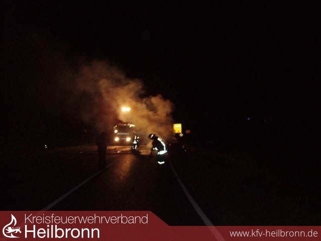 Beim Eintreffen der um 4:07 Uhr alarmierten Feuerwehr Leingarten stand der Audi bereits im Vollbrand. Von einem Trupp unter Atemschutz wurde das Feuer mit Wasser und Schaum gelöscht.Vom Fahrer des Fahrzeugs fehlte allerdings jede Spur. Da zunächst nicht ausgeschlossen werden konnte, dass sich der Fahrer eventuell verletzt in der Nähe aufhält, wurde die Umgebung von Feuerwehrleuten und zwei Polizeistreifen abgesucht.Schließlich wurde von einer Polizeistreife in der Nähe ein Mann aufgegriffen, bei dem es sich eventuell um den Fahrer handeln könnte. Zur Klärung des Sachverhalts wurde der Mann von der Streifenwagenbesatzung zum Polizeirevier gebracht.
