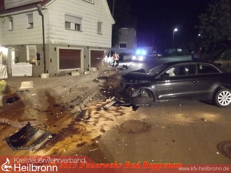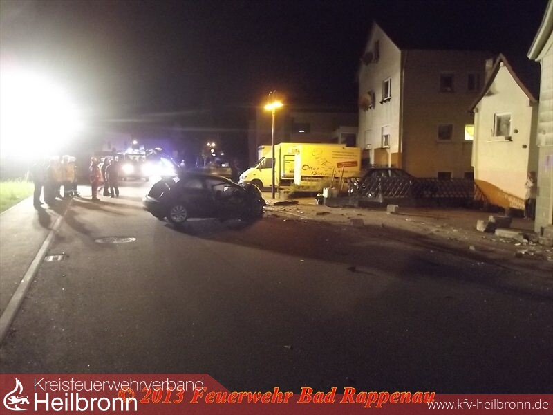 Ein Kleinwagen kam aus unbekannter Ursache nach rechts von der Fahrbahn ab, streifte eine Straßenlaterne und prallte in ein Wohnhaus.