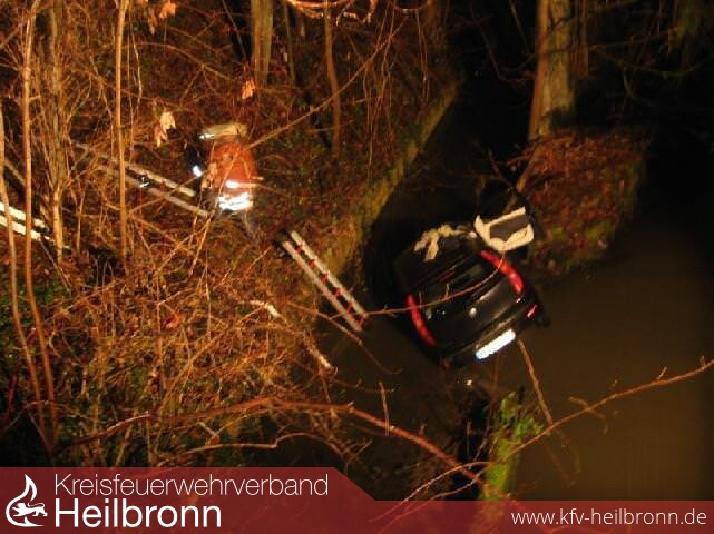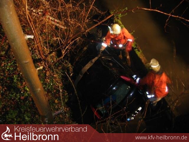 Gegen 05.30 Uhr befuhr er mit seinem Fiat Punto die Landesstraße von Meimsheim in Richtung Lauffen. Auf Höhe der Schellenmühle kam er nach rechts von der Fahrbahn ab. Das Fahrzeug kam nach Überwindung einer Böschung in der Zaber zum Stehen. Die drei Insassen erlitten zum Glück nur leichte Verletzungen. Die Freiwillige Feuerwehr Brackenheim war mit 18 Mann im Einsatz. Dem Unfallverursacher wurde Blut entnommen, der Führerschein wurde beschlagnahmt.