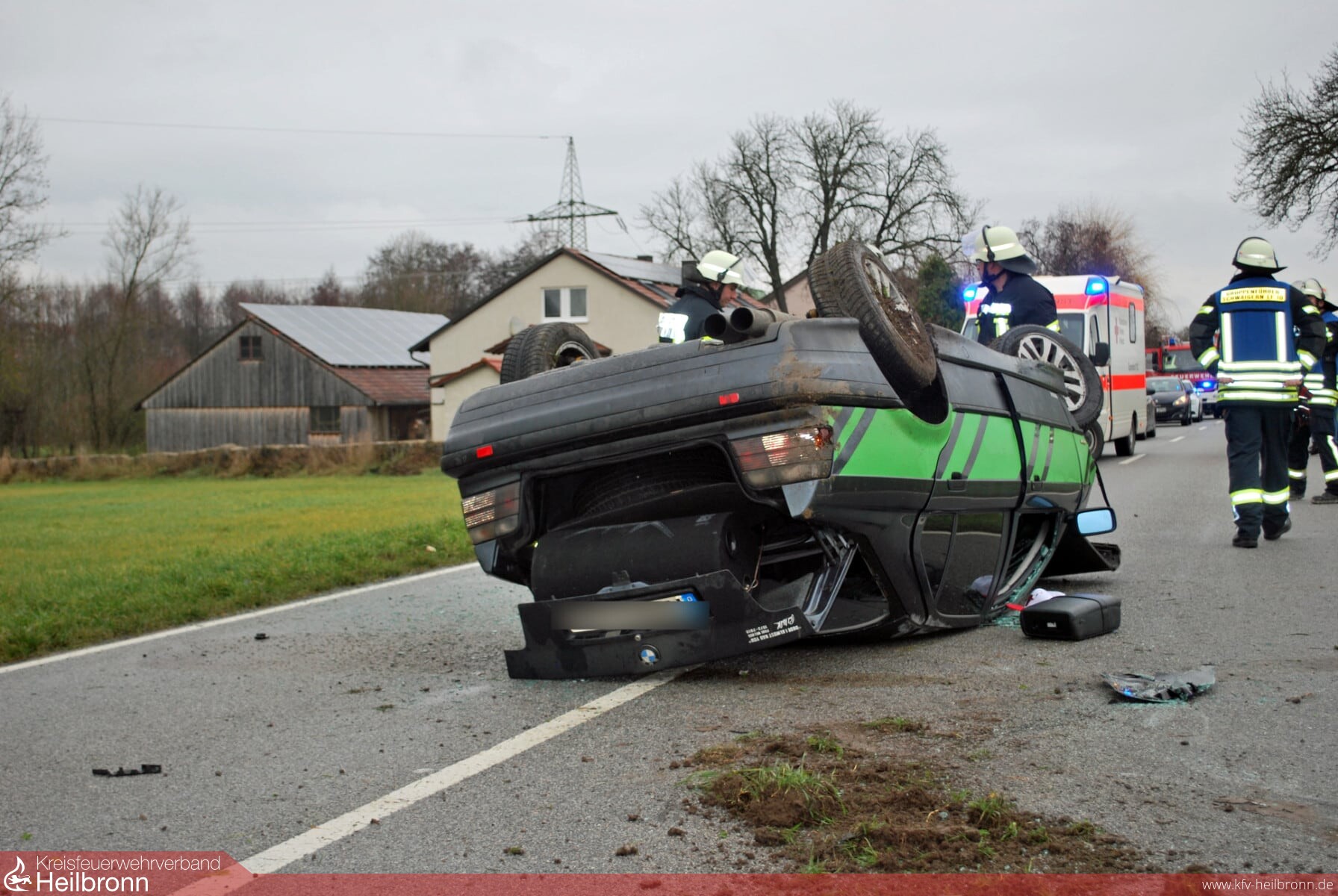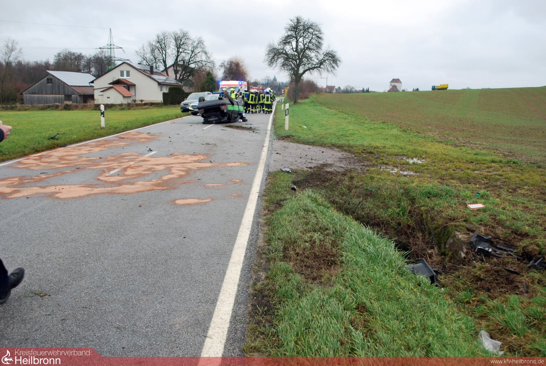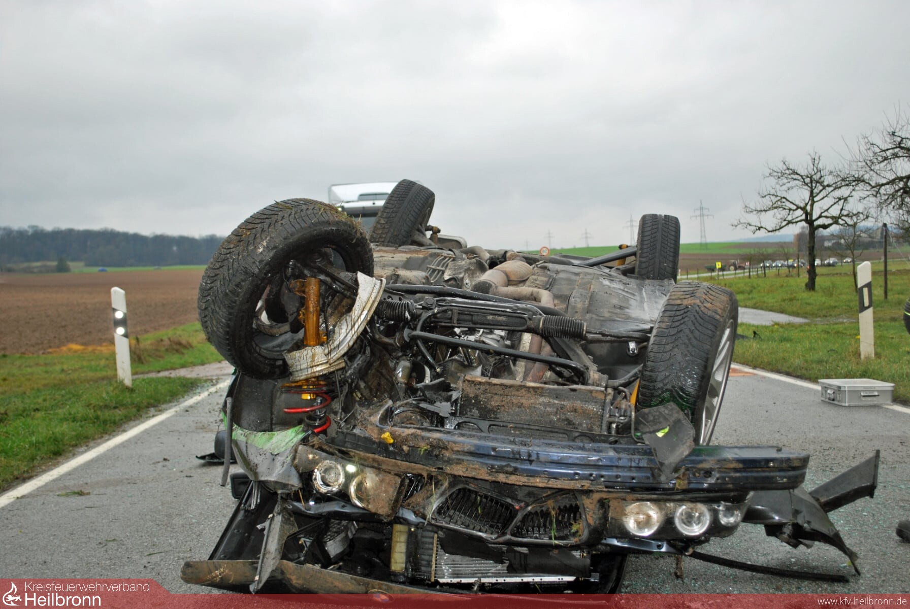 Auf der Kreisstrasse zwischen Schwaigern und dem Stadtteil Stetten a.H. war ein PKW-Fahrer nach rechts von der Fahrbahn abgekommen und landete im Straßengraben. Dort stieß er gegen die Verdohlung eines abzweigenden Feldwegs. Daraufhin katapultierte das Fahrzeug zurück auf die Strasse und blieb dort auf dem Dach liegen.