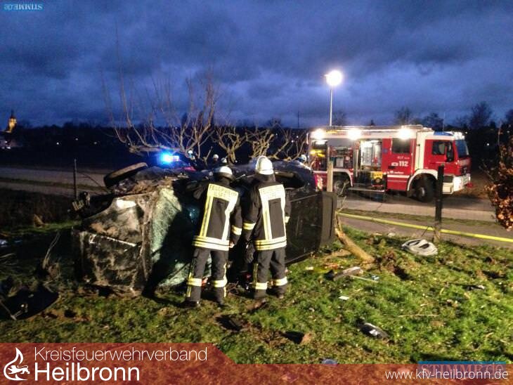 Zwei Insassen aus Personenwagen herausgeschleudert Ein auf dem Burgweg von Auenstein in Richtung Ilsfeld fahrender 20-jähriger Fiatlenker geriet am heutigen Samstag gegen 16.10 Uhr im Ausgang einer Linkskurve vermutlich infolge überhöhter Geschwindigkeit zunächst auf den Grünstreifen rechts neben der Fahrbahn und im Anschluss daran nach links von der Fahrbahn ab. Der Fiat prallte schließlich gegen einen Pfeiler eines Gartentores und gegen eine Mauer bevor sich das Fahrzeug mehrmals überschlug. Eine 40-jährige Mitfahrerin und ein 16-jährige Mitfahrer wurden aus dem Fahrzeug herausgeschleudert. Die beiden genannten Mitfahrer, der Fahrer und sein 17-jähriger Beifahrer mussten mit schweren Verletzungen in ein Krankenhaus eingeliefert werden. Der entstandene Sachschaden beläuft sich auf etwa 13.000 Euro. Es war auch ein Rettungshubschrauber an den Unfallort entsandt worden.