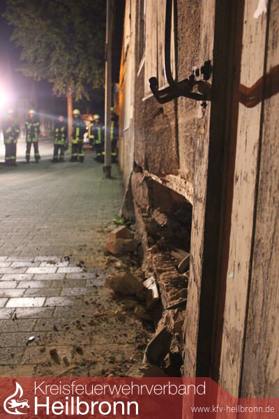 Beim Eintreffen der Einsatzstelle, war diese bereits durch eine Polizeistreife abgesichert. Personen waren nicht verletzt. Der nicht mehr fahrbereite Pkw stand noch in Unfallendstellung und hatte an dem Gebäude mit Fachwerktechnik im unteren Bereich auf ca. 4 Meter die Hauswand eingedrückt. Da die weitere Hauswand erkennbare Risse zeigte und von den Einsatzkräften eine Einsturzgefahr nicht ausgeschlossen werden konnte, wurde von der ILS der Fachberater Bautechnik vom THW alarmiert. Weil durch den Unfallhergang auch die Hauszugangsleitung teilweise aus dem Sicherungskasten herausgerissen war, wurde zudem noch der Stromversorger angefordert.