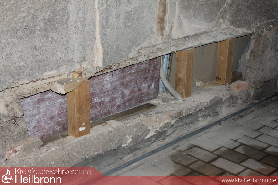 Nach einer Begutachtung, die keine Einsturzgefahr zum Ergebnis hatte, wurde das Fachwerkgebälk mit Kanthölzern abgestützt und die Öffnung mit einer Schaltafel gesichert. Die am Fahrzeug ausgetretenen Betriebsstoffe wurden abgebunden und die Verunreinigung aufgenommen.