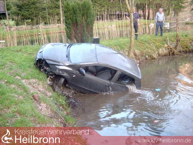 Für zwei junge Männer wurde der Freitag der 13. wirklich zum Unglückstag. Gegen 17:43 Uhr waren die Beiden mit ihrem Wagen auf der L 1090 zwischen Wüstenrot und Neulautern unterwegs. Vermutlich aufgrund nicht angepasster Geschwindigkeit verlor der Fahrer die Kontrolle über sein Fahrzeug und kam von der Straße ab. Nach dem ein tiefer gelegenes Wiesenstück überquert war, endete die Fahrt schließlich in einem Forellenteich wo der Volkswagen vollständig versank. Mit leichten Verletzungen konnten sich beide Insassen selbst befreien und ans Ufer schwimmen.