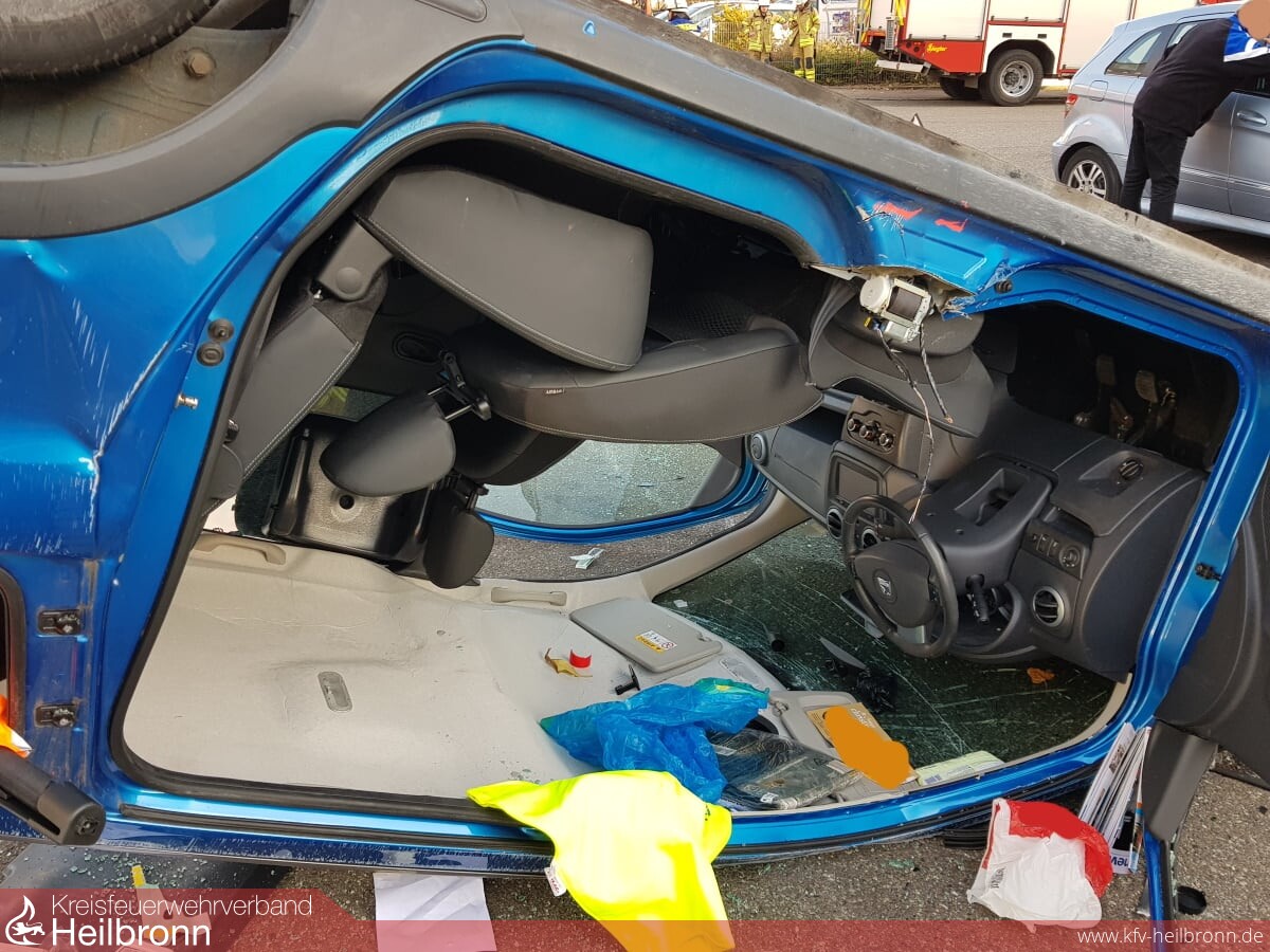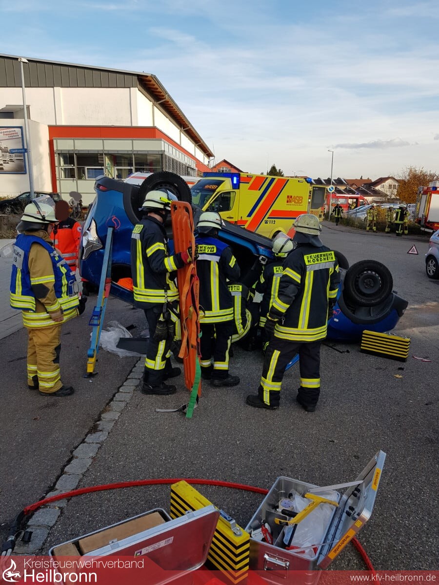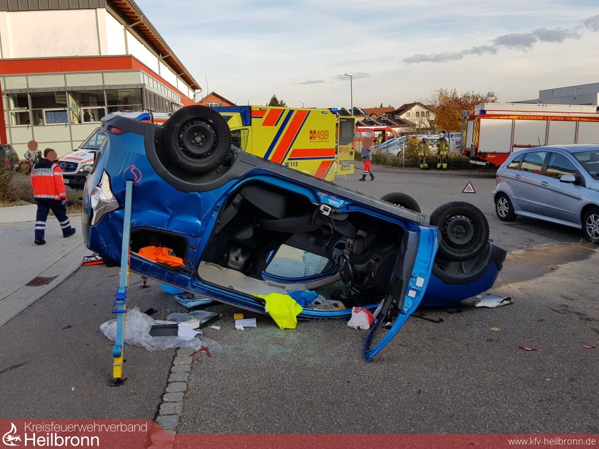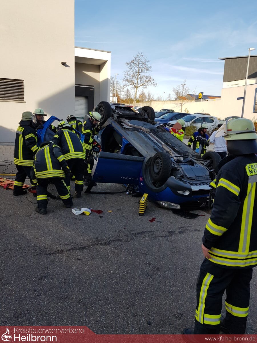 Bis zum Eintreffen der Kräfte aus Lauffen und Heilbronn war der auf dem Dach liegende PKW bereits durch ein Stab-Fast-System abgesichert. Durch Notarzt und Rettungsdienst wurde die im PKW liegende Person versorgt und betreut, während von der Feuerwehr auf der anderen Fahrzeugseite her eine Rettungsöffnung geschaffen worden ist. Die weiteren Unfallbeteiligten wurden von der Feuerwehr und dem Rettungsdienst betreut.