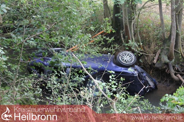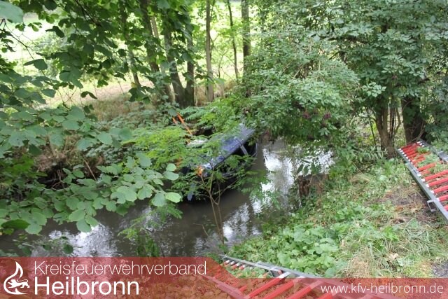 Aus noch nicht geklärter Ursache ist die Führerin eines Pkw auf Ihrem Weg von Meimsheim in Richtung Lauffen mit ihrem Kfz von der Fahrbahn der L 1103 abgekommen und im Flussbett der Zaber liegen geblieben.