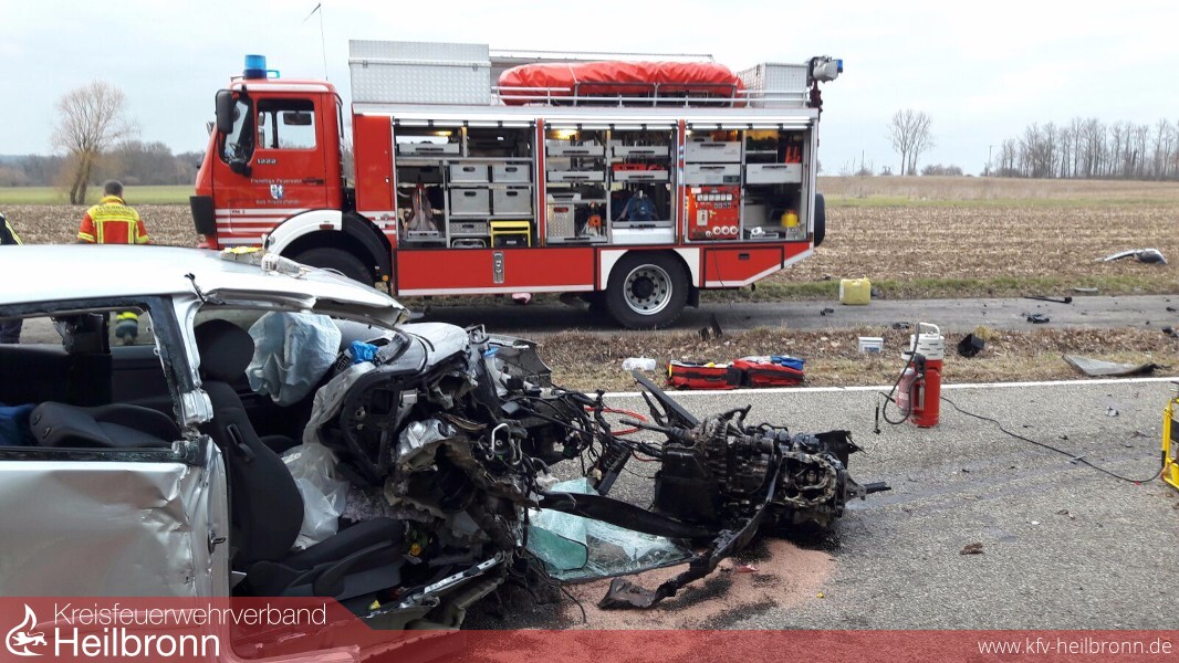 Gemäß der Alarm- und Ausrückeordnung wurden die Feuerwehren Offenau und Bad Friedrichshall auf die Kreisstraße 2030 zwischen Bad Friedrichshall - Duttenberg und Offenau alarmiert. Kurz vor dem Ortseingang Offenau aus Duttenberg kommend, kam eine 20 jährige PKW Fahrerin nach rechts von der Fahrbahn ab und prallte gegen einen Baum. Durch die Wucht es Aufpralls wurde das Fahrzeug wieder auf die Fahrbahn geschleudert und der Motor aus seiner Verankerung am Fahrzeug gerissen. Die Fahrerin war in ihrem völlig demolierten Fahrzeug eingeklemmt und musste von den Feuerwehren unter Vornahme von zwei Hydraulischen Rettungssätzen befreit werden. Um eine patientengerechte Rettung durchführen zu können, wurde in Absprache mit dem Rettungsdienst, dass Dach des PKW komplett entfernt. Von der Feuerwehr wurden die massiv ausgetretenen Betriebsmittel aufgenommen und der Brandschutz sichergestellt.