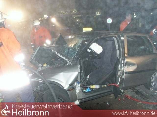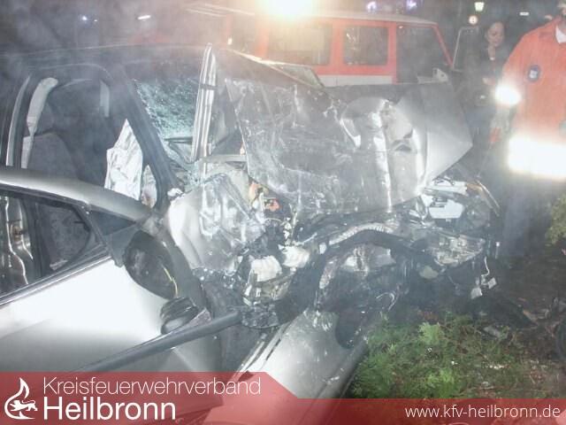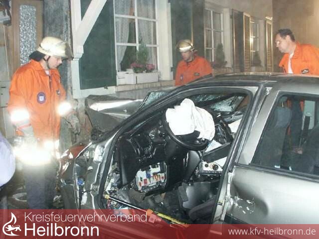 Auf der Neuenstädter Straße war ein PKW ungebremst auf die Hauswand der Gaststätte Adler geprallt. Der Fahrer wurde eingeklemmt, das Fahrzeug begann zu brennen.