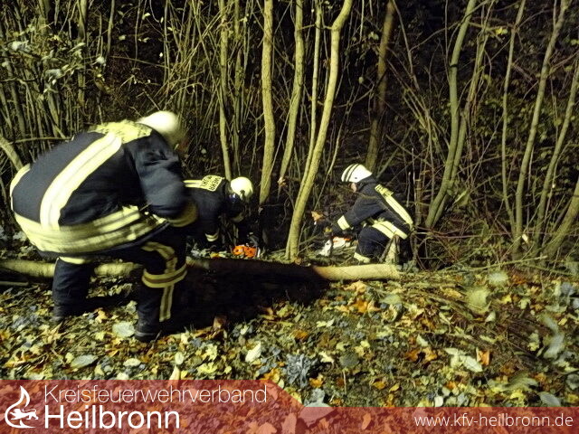 Die Feuerwehr beseitigte mehrere Bäume und Heckenbüsche um an das Fahrzeug zu gelangen und es anschließend zu bergen.