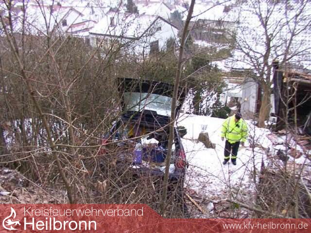 Ein PKW war eine Böschung hinuntergestürzt, auf das Dach eines Gartenhäuschens geprallt und anschließend neben dem Gartenhaus in der Böschung hängend zum Stillstand gekommen.