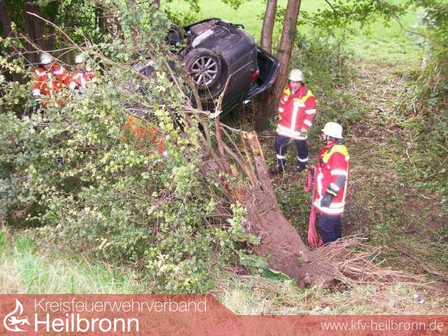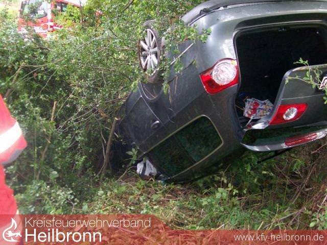 Ein PKW, war auf der B 27 von Gundelsheim Richtung Offenau unterwegs. In der Mitte dieser Strecke kam dieser von der Fahrbahn ab und stürzte eine Böschung hinunter. Beim Notruf wurden drei eingeklemmte Personen gemeldet. So wurde zu dem Rettungsdienst auch die Feuerwehr Gundelsheim alarmiert. Entsprechend der Alarm und Ausrückeordnung wird der Rüstwagen aus Bad Friedrichshall zusätzlich alarmiert. Beim Eintreffen an der Einsatzstelle wurde ein PKW, auf dem Dach liegend, am Fuße der Böschung zwischen Bäumen und Wildwuchs vorgefunden. Entgegen der Alarmmeldung war zum Glück niemand eingeklemmt. Die Feuerwehr unterstützte den Rettungsdienst beim Transport der Patienten, die steile Böschung hinauf.