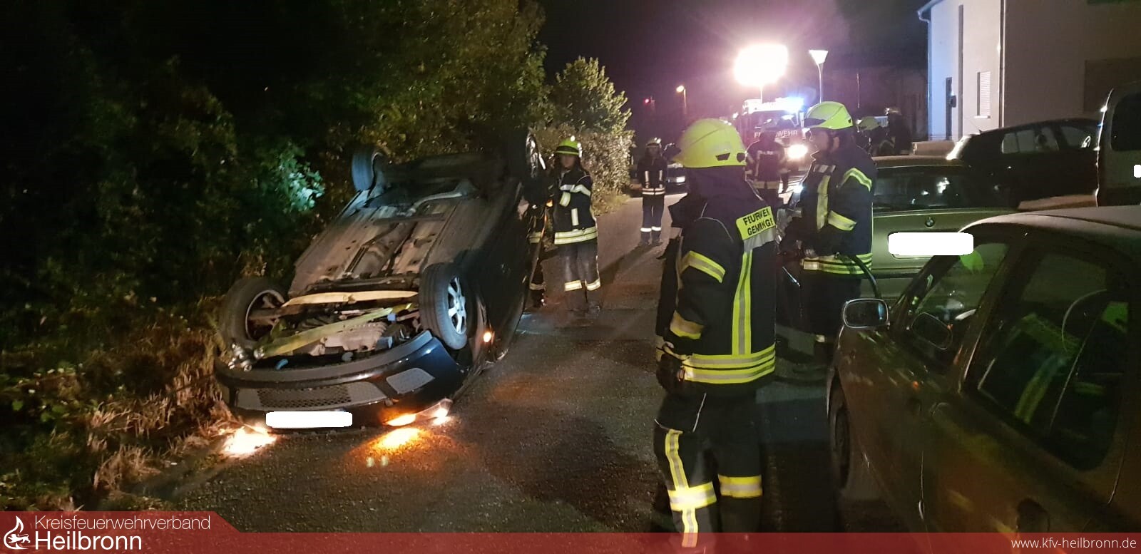 Beim Eintreffen der Einsatzkräfte lag der PKW des Betroffenen auf dem Dach. Daneben stand ein parkender geschädigter BMW. Da der 22-jähriger Fahrer und die Beifahrerin sich noch vor dem Eintreffen der Feuerwehr und Polizei selbst aus dem betroffenen Ford Fiesta befreien konnten und unverletzt geblieben sind, wurde von einer Nachalarmierung des Rettungsdienstes abgesehen.