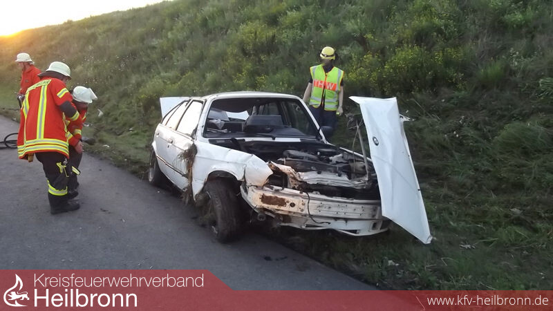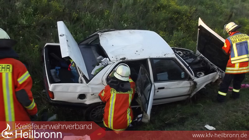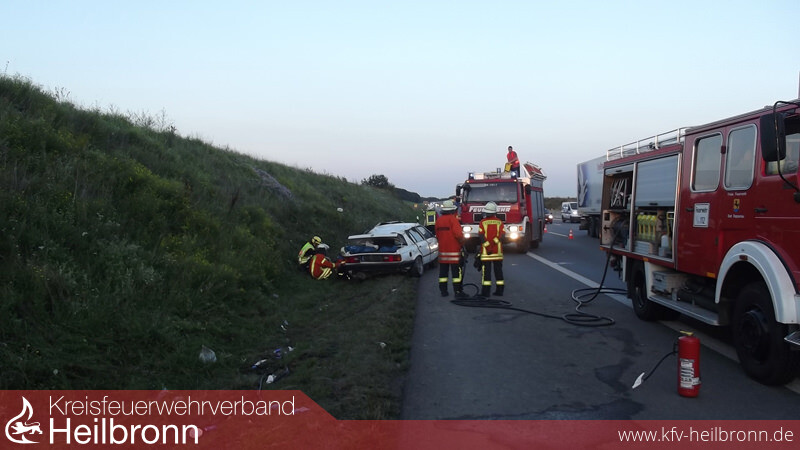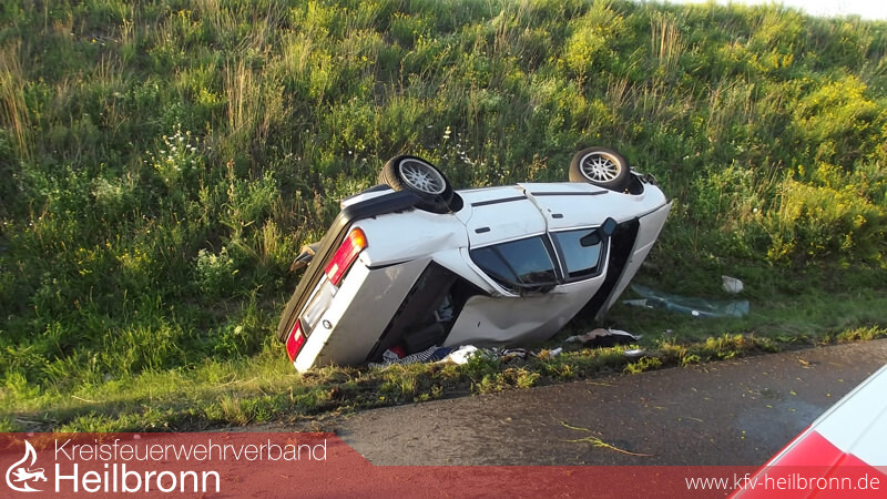 Zwischen den Anschlussstellen Bad Rappenau und Sinsheim-Steinsfurt war ein PKW aus unbekannter Ursache nach rechts in den angrenzenden Grünstreifen geschleudert. Hierbei hatte sich der PKW überschlagen und blieb auf der Seite liegen.