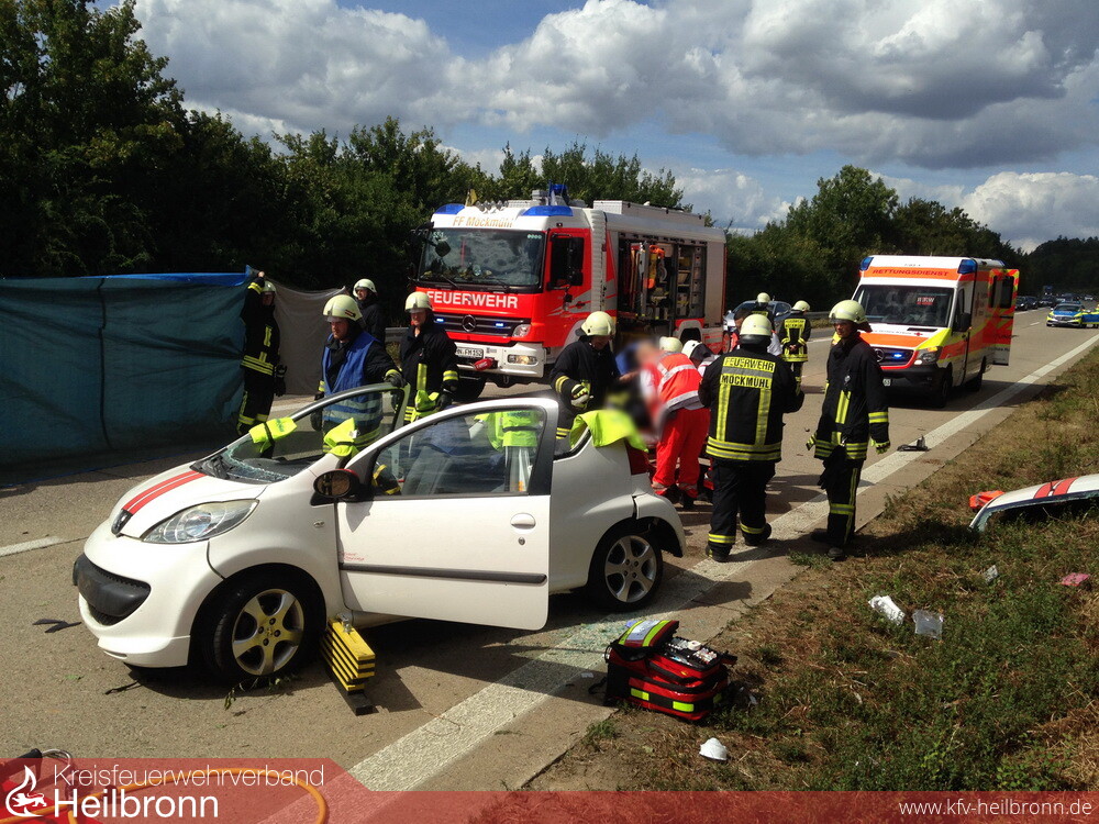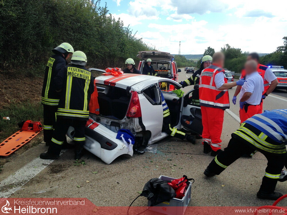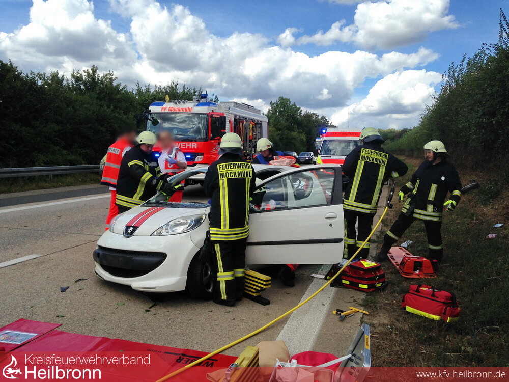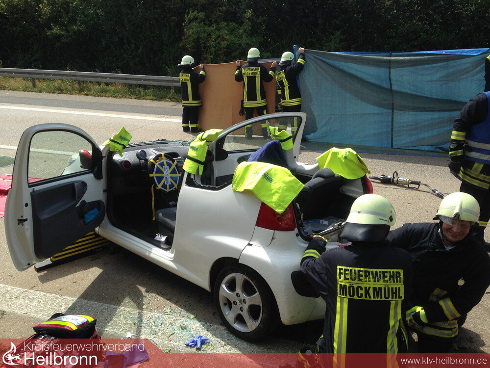 Zu einem Verkehrsunfall mit einer eingeklemmten Person, wurde die Abteilung Möckmühl, auf die BAB 81 in Fahrtrichtung Stuttgart gerufen. Bei Km 520,00 kam eine Pkw-Lenkerin mit ihrem Peugeot, aus ungeklärter Ursache, nach links von der Fahrbahn ab und schleuderte in die angrenzende Böschung. Der Pkw überschlug sich und wurde total zerstört. Auf Grund des Verletzungsmusters der Verunfallten, nahm die Feuerwehr das Dach des Pkw ab und rettete die Frau mit einem Spineboard aus dem Wrack. Wegen zahlreicher Amateurfilmer, welche das Geschehen beim vorbeifahren unbedingt mit ihrem Handy festhalten mussten, erstellten die Einsatzkräfte erstmalig einen Sichtschutz an der Unfallstelle.