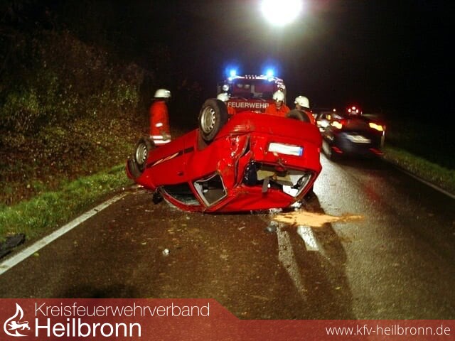 Ca 2 km nach Möckmühl kam eine PKW-Fahrerin, als sie einem Wildtier ausweichen wollte, mit ihrem Fahrzeug von der Fahrbahn ab, überschlug sich mehrfach und blieb auf dem Dach liegen. Als erste Einsatzmeldung wurde außerdem auslaufender Kraftstoff und eine Rauchentwicklung am PKW gemeldet.
