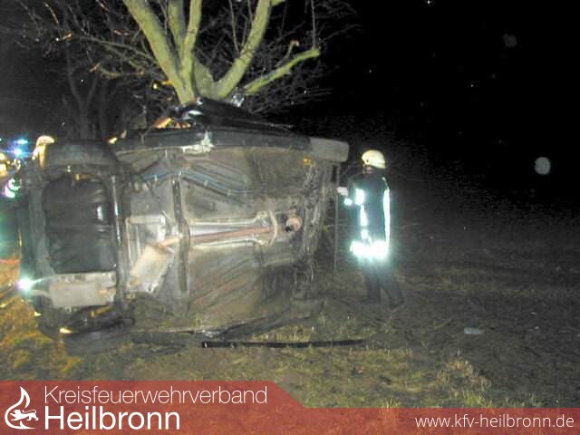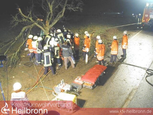 Tödlich endete am 12.01.2005 gegen 17:23 Uhr ein Verkehrsunfall auf der Kreisstraße zwischen Heilbronn-Biberach und Bad Wimpfen. Trotz Gegenverkehr setzte der Fahrer eines VW Golf zum Überholen eines Zweirades an. Während des Überholens bemerkte der Fahrer, dass er den Überholvorgang aufgrund des geringen Abstandes zum Gegenverkehr nicht ordnungsgemäß beenden konnte und zog sein Fahrzeug ruckartig nach rechts. Hierbei geriet er ins Schleudern, kam von der Straße ab und schanzte über eine kleine Böschung. Unglücklicherweise drehte sich hierdurch das Fahrzeug auf die linke Längsseite und prallte mit dem Dach voraus gegen einen Baum am Straßenrand. Durch die große Wucht des Aufschlages wickelte sich der Pkw förmlich um diesen Baum, was die Rettung als sehr schwierig gestaltete. Unter Einsatz von zwei Spreizern und Schneidgeräten sowie zwei maschinellen Zugeinrichtungen konnte der Verunfallte dennoch in einer angemessenen Zeit befreit und dem Rettungsdienst zur weiteren Versorgung übergeben werden. Der Verletze wurde ins städtische Krankenhaus gebracht, wo er an den Unfallfolgen verstarb.