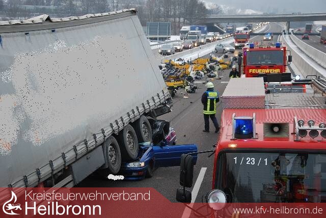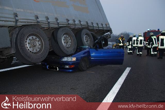 Glück im Unglück hatte ein PKW-Fahrer bei einem Verkehrsunfall am Dienstag gegen 16.23 Uhr auf der Autobahn A6. Ein 53-jähriger türkischer Sattelzugfahrer kam auf dem rechten Fahrstreifen bei km 642 in Richtung Nürnberg ins Schlingern und überrollte mit den linken Reifen seines Sattelzugs halbseitig den daneben auf dem linken Fahrstreifen fahrenden PKW Ford Cabrio. Nachdem sich eine Achse des Sattelzugs im PKW verkeilt hatte, wurde der PKW noch ca. 70 Meter weit mitgeschleift. Der alleinige 22-jährige Insasse im Ford konnte durch unbeteiligte Verkehrsteilnehmer aus seinem Fahrzeug gerettet werden und wurde durch das DRK mit mittelschweren Verletzungen in die SLK Am Gesundbrunnen verbracht. Der Sattelzugfahrer blieb unverletzt. Ein Teil der Ladung des Sattelaufliegers, fabrikneue Renault-Motoren, wurden auf die Fahrbahn geschleudert. Zur Klärung des Versicherungsschadens wurde ein Havariekommissar an die Unfallstelle gerufen.