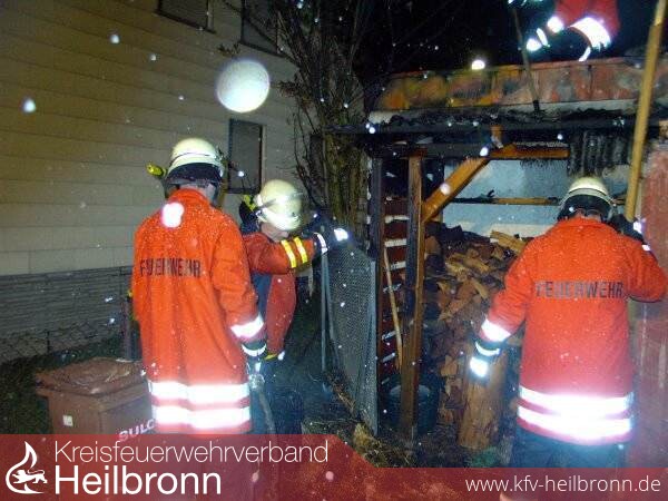 Kurz vor 19 Uhr sahen die beiden durch die Häldenstraße fahrenden Polizeibeamten Feuerschein in einem Holzverschlag. Als sie nachsahen wurde rasch klar, dass dort ein Komposter und gelagertes Brennholz in Flammen standen.