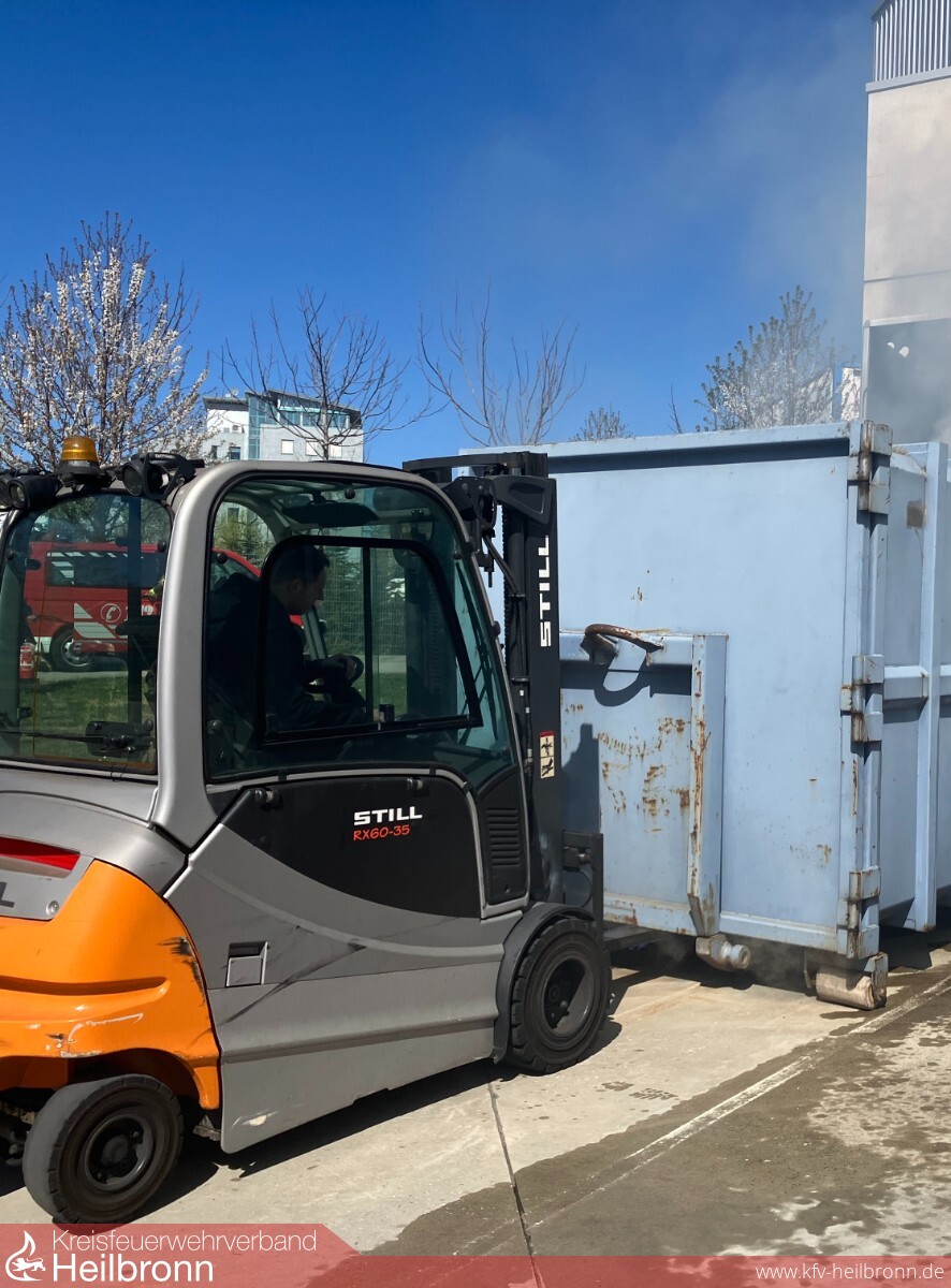 Nennenswert war auch der Brand bei einem Heilbronner Logistikunternehmen im Industriegebiet „Böllinger Höfe“. Dort war es in einem Presscontainer für Kartonagen an einer der Laderampen zu einem Feuer gekommen. Teile der Lagerhalle waren beim Eintreffen der Feuerwehr bereits verraucht, so dass auch hier die Brandmeldeanlage auslöste. Die Einsatzkräfte schafften den Container mit Hilfe eines Gabelstaplers auf eine freie Fläche. Dort wurde er geöffnet und mit Hilfe eines Wechselladerfahrzeuges abgekippt. Anschließend konnte der Inhalt auseinandergezogen und abgelöscht werden. Hierbei kam auch ein Teleskoplader der Feuerwehr zum Einsatz.