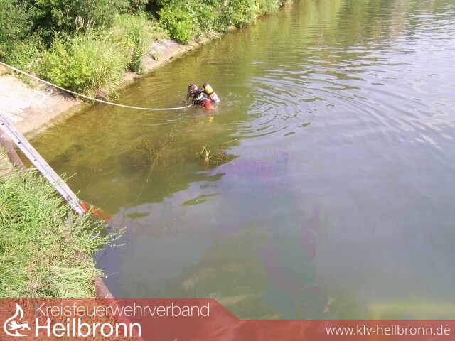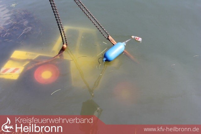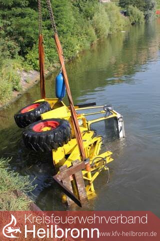 Mit dem Einsatzstichwort \"Gewässerverunreinigung\" rückte der Rüstzug der Feuerwehr Lauffen, sowie die Taucher und der Kran der Berufsfeuerwehr Heilbronn zum Neckar aus. An der Einsatzstelle eingetroffen, konnte ein auf der Seite liegender Radlader in einer Wassertiefe von rund zwei Metern festgestellt werden.