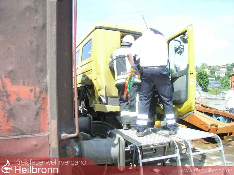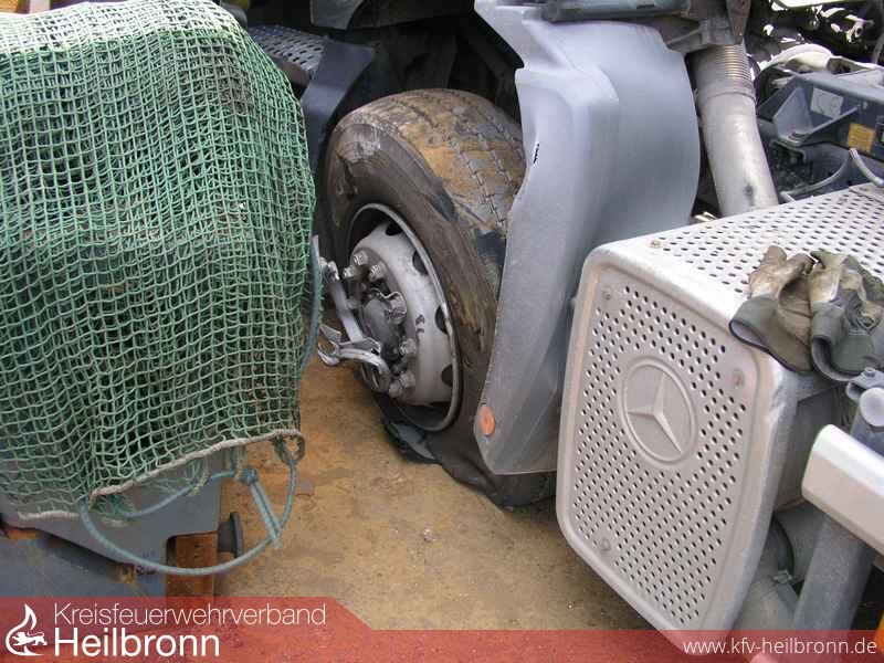 Eine Befreiung des durch den Aufprall leicht verletzten LKW-Fahrers aus dem zum Teil zerstörten Fahrerhaus war ohne technisches Gerät möglich.