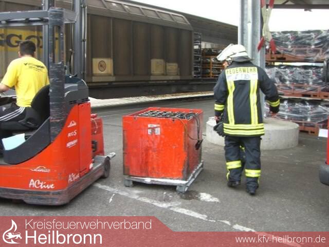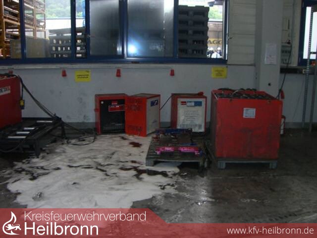 Durch einen Staplerfahrer wurden die ersten Löscharbeiten mit einem Schaumlöscher vorgenommen. Nachlöscharbeiten erfolgten durch die WF AUDI. Die Batterie und das Ladegerät wurden ins Freie gebracht.