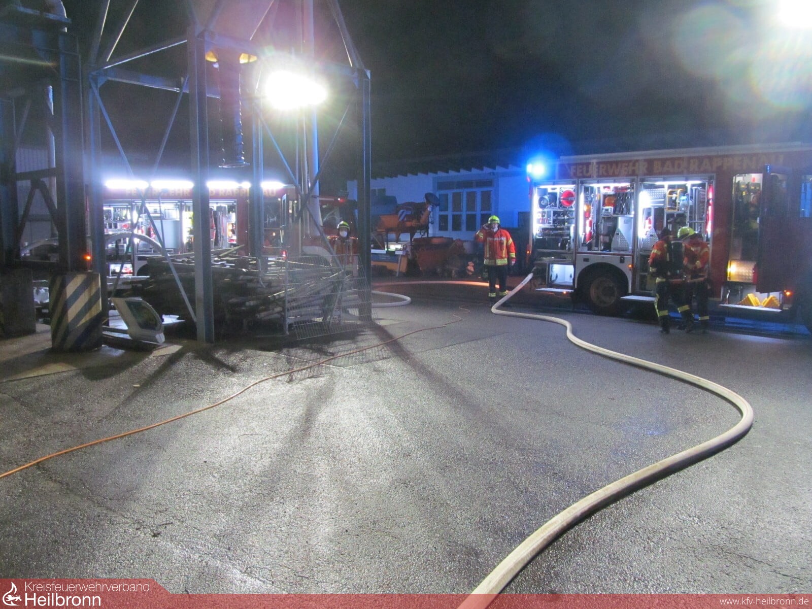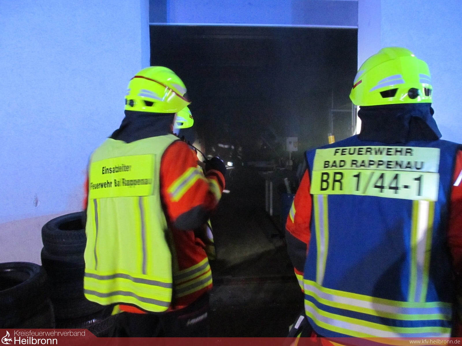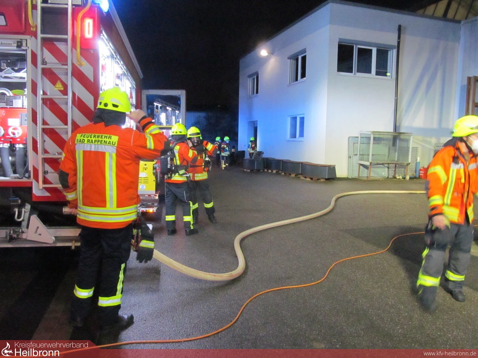 Mit dem Alarmstichwort „Gebäudebrand“ wurde die Freiwillige Feuerwehr Bad Rappenau am Dienstagabend alarmiert. Gemeldet war eine Rauchentwicklung in einer Halle des städtischen Bauhofes, direkt hinter dem Feuerwehrhaus. Dementsprechend schnell war das erste Löschfahrzeug an der Einsatzstelle eingetroffen. Der Gruppenführer des ersten Löschfahrzeuges führte erste Erkundungsmaßnahmen durch während der Angriffstrupp einen Löschangriff vorbereitete. Da die Rauchentwicklung aus der Werkstatt kam, wurde diese mittels Rauchvorhang vom Rest des Gebäudes abgeschirmt. Zeitgleich ging der Angriffstrupp unter Atemschutz mit einem C-Hohlstrahlrohr zur Brandbekämpfung vor. Dieser konnte schnell Entwarnung geben. Die Rauchentwicklung entstand durch einen schmorenden Akku einer Lampe in einer Ladestation. Offene Flammen waren nicht sichtbar. Die Feuerwehr leitete Entlüftungsmaßnahmen ein und belüftete die Werkstatt und das Gebäude. Anschließend wurde die Einsatzstelle dem Bauhofleiter übergeben und die Einsatzkräfte konnten wieder einrücken. Im Einsatz waren 4 Fahrzeuge und circa 18 Einsatzkräfte.