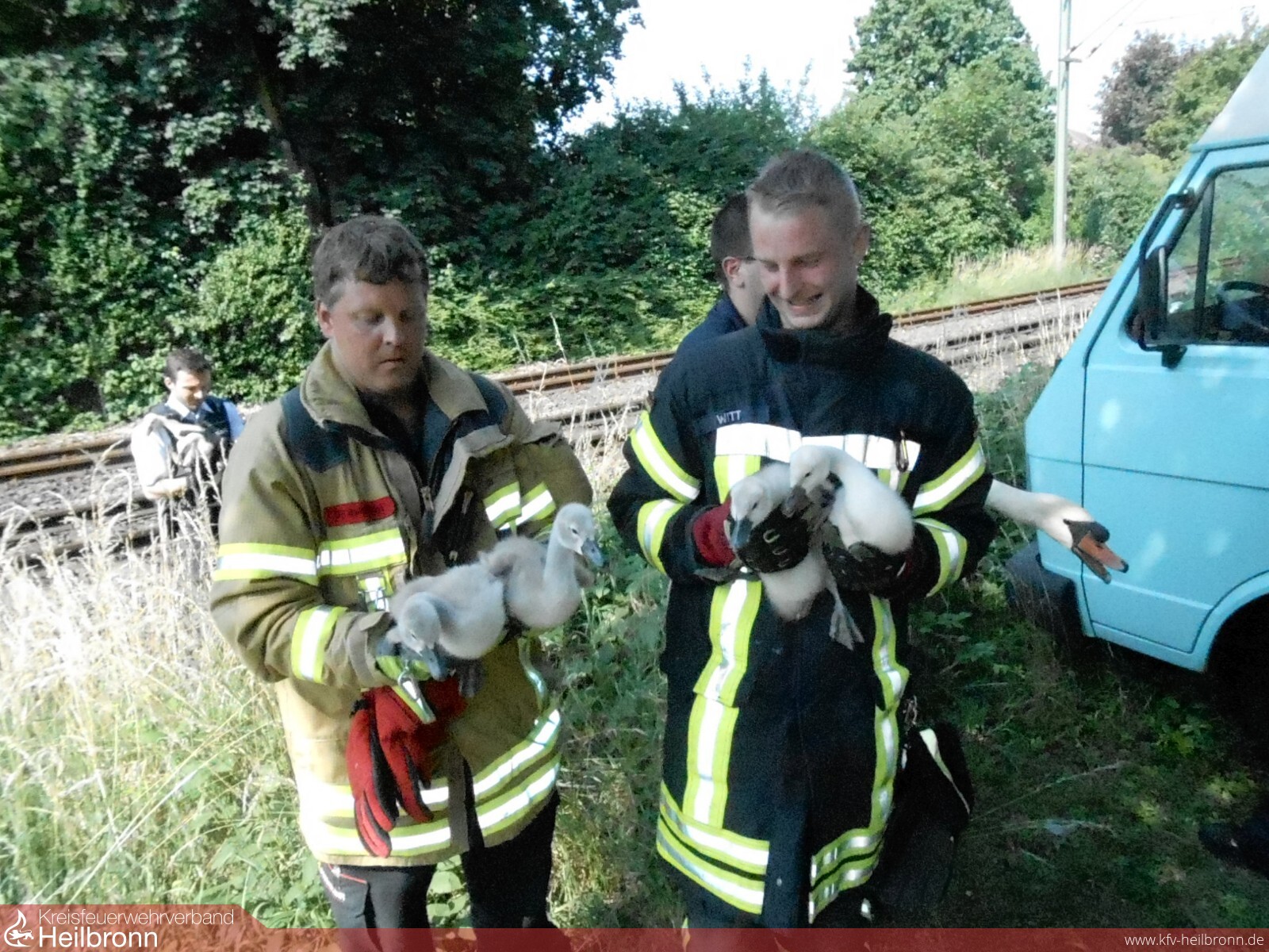 Beim Eintreffen vor Ort stolzierten zwei Schwaneneltern mit insgesamt 6 Jungtieren auf den Schienen der Stadtbahn herum. Schnell war klar, dass es sich hierbei um „alte Bekannte“ handelte, die bereits mehrfach auf öffentlichen Verkehrsflächen im Bereich des Pfühlparks eingefangen und zurück in den Park gebracht werden mussten.