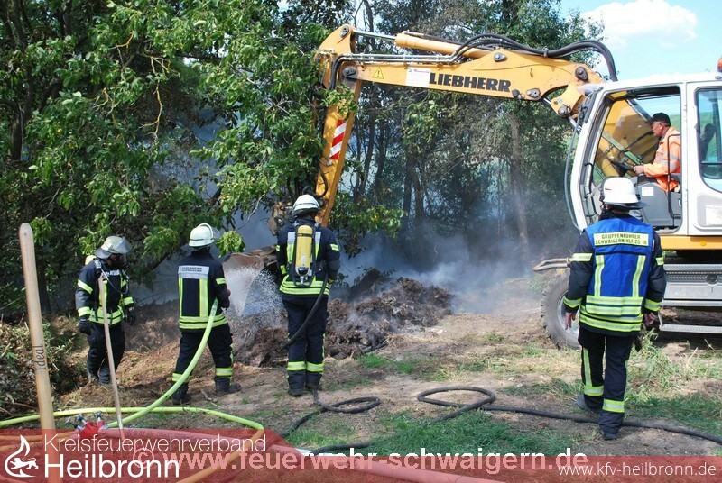 Unterstützung bekam die Feuerwehr bei den Löscharbeiten durch einen in der Nähe arbeitenden Baggerfahrer, der den Reisighaufen auseinander zog und so die Löscharbeiten erleichterte.