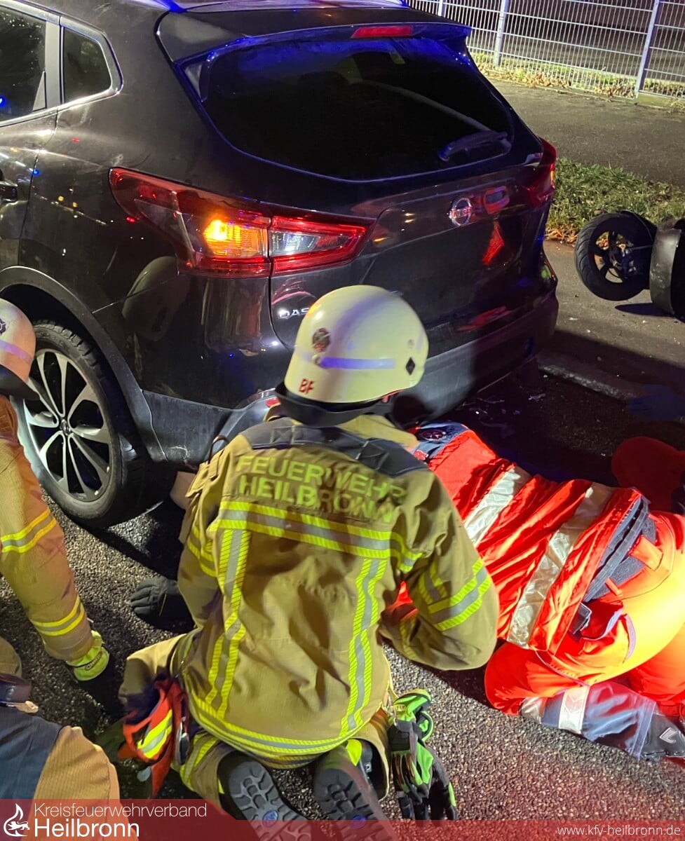 Am Samstag, 31. Januar geriet gegen 18 Uhr ein Rollerfahrer nach einem Sturz in der Sontheimer Straße unter ein Fahrzeug. Hierbei wurde er unter dem Heckbereich des Wagens eingeklemmt. Zur Befreiung des Mannes mussten die Einsatzkräfte das Auto sichern und anheben. Hierfür kamen hydraulische Rettungsgeräte sowie Unterbaumaterial zum Einsatz. Nach einer Erstversorgung vor Ort wurde der Verletzte in ein Krankenhaus eingeliefert.