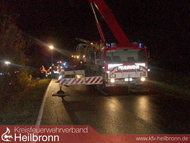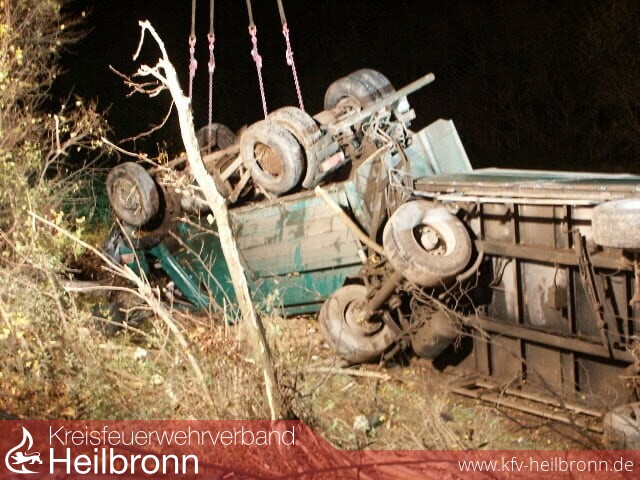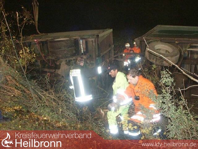 Die Friedrichshaller Feuerwehr rückte mit 15 Mann an und sicherte die Unfallstelle. Mit einem Kran der Feuerwehr Heilbronn bargen die Feuerwehrleute in der Zeit zwischen 04.00 Uhr und 07.45 Uhr das verunglückte Gespann. Zuvor mussten die sich noch im Anhänger befindlichen Rüben von Hand ausgeladen werden. Zur Ausleuchtung der Einsatzstelle kamen drei Fahrzeuge mit Lichtmasten zum Einsatz. Nach der Bergung wurde die Straße unter Einsatz des Tanklöschfahrzeuges und eines Arbeitsgerätes der Straßenmeisterei gereinigt. Die Zufahrt von der B 27 her in Richtung Duttenberg war in dieser Zeit nicht möglich. Der Schaden am Lkw und am Hänger wird auf mindestens 30.000 Euro geschätzt.