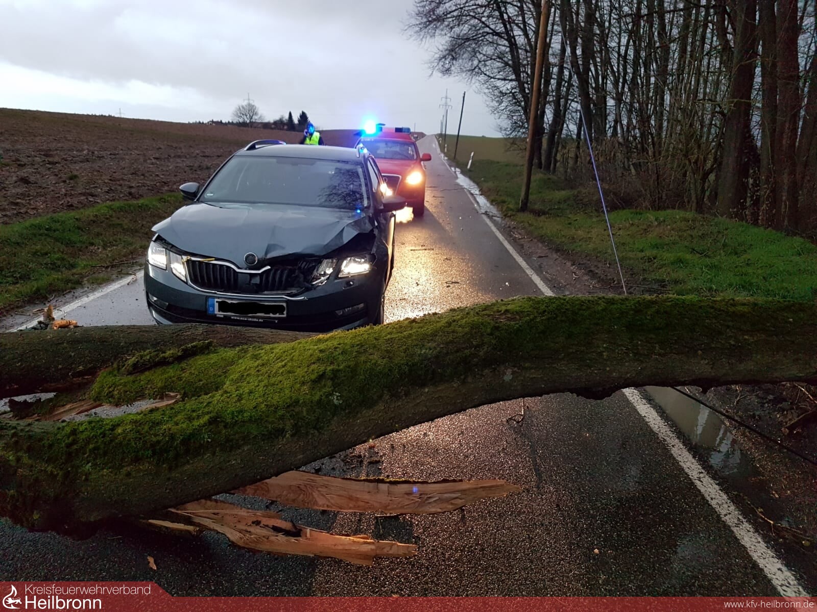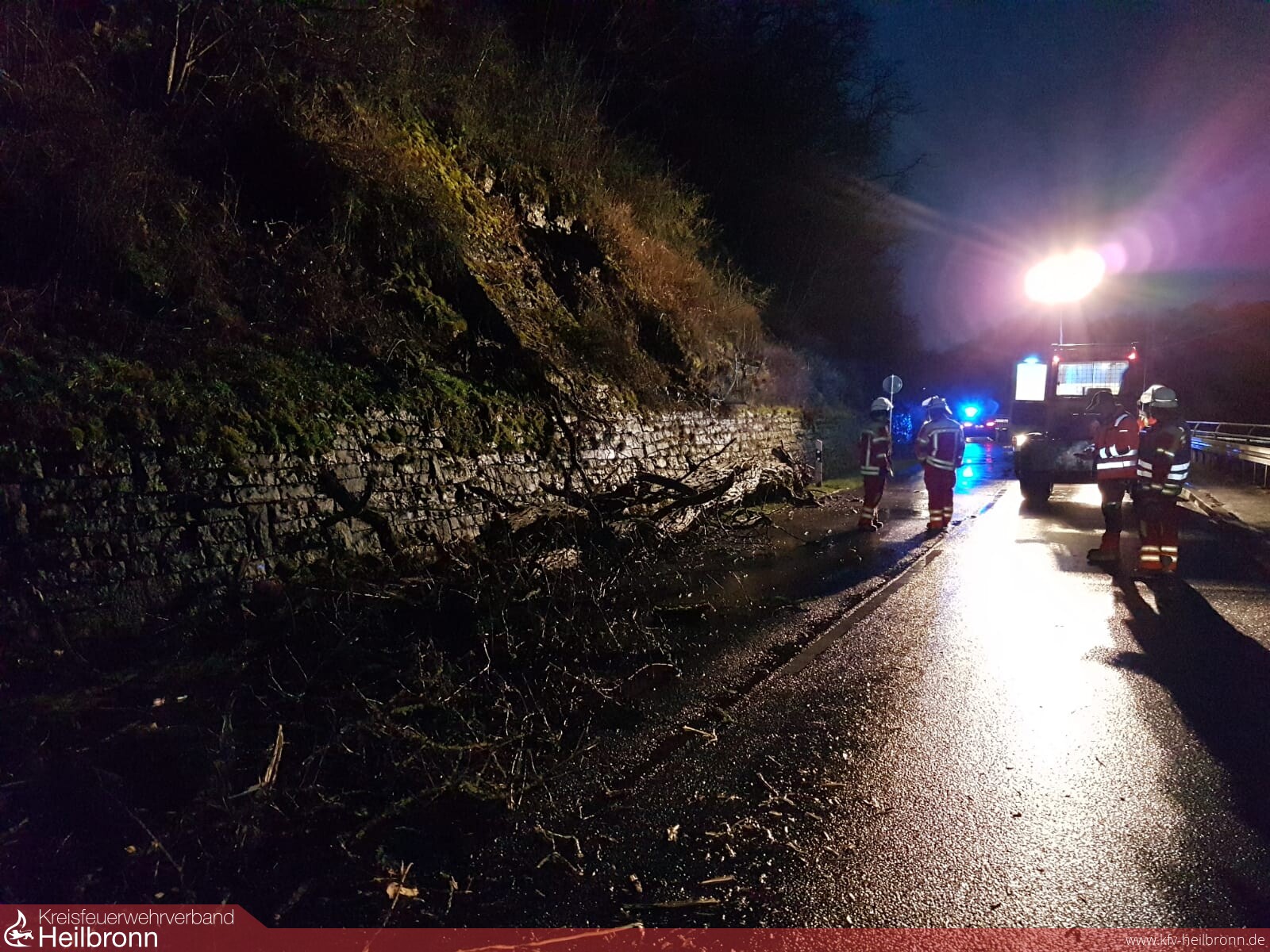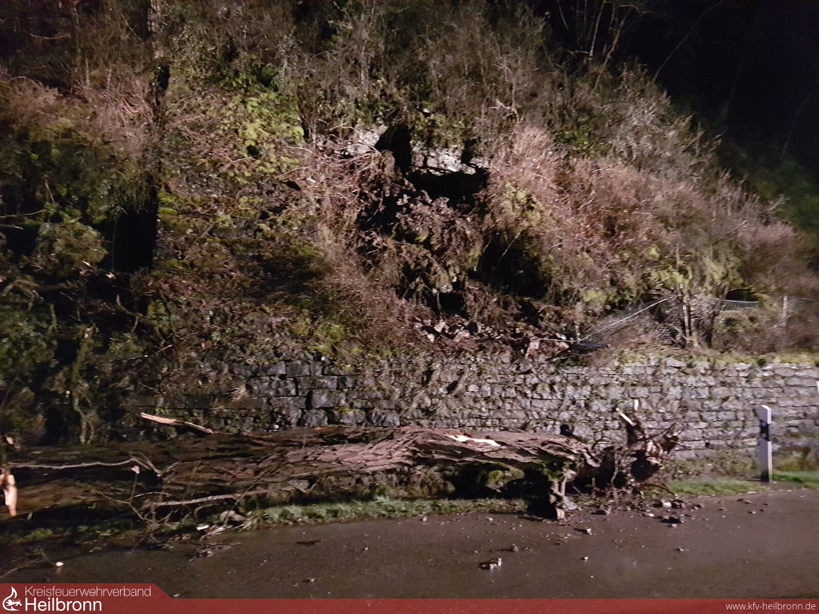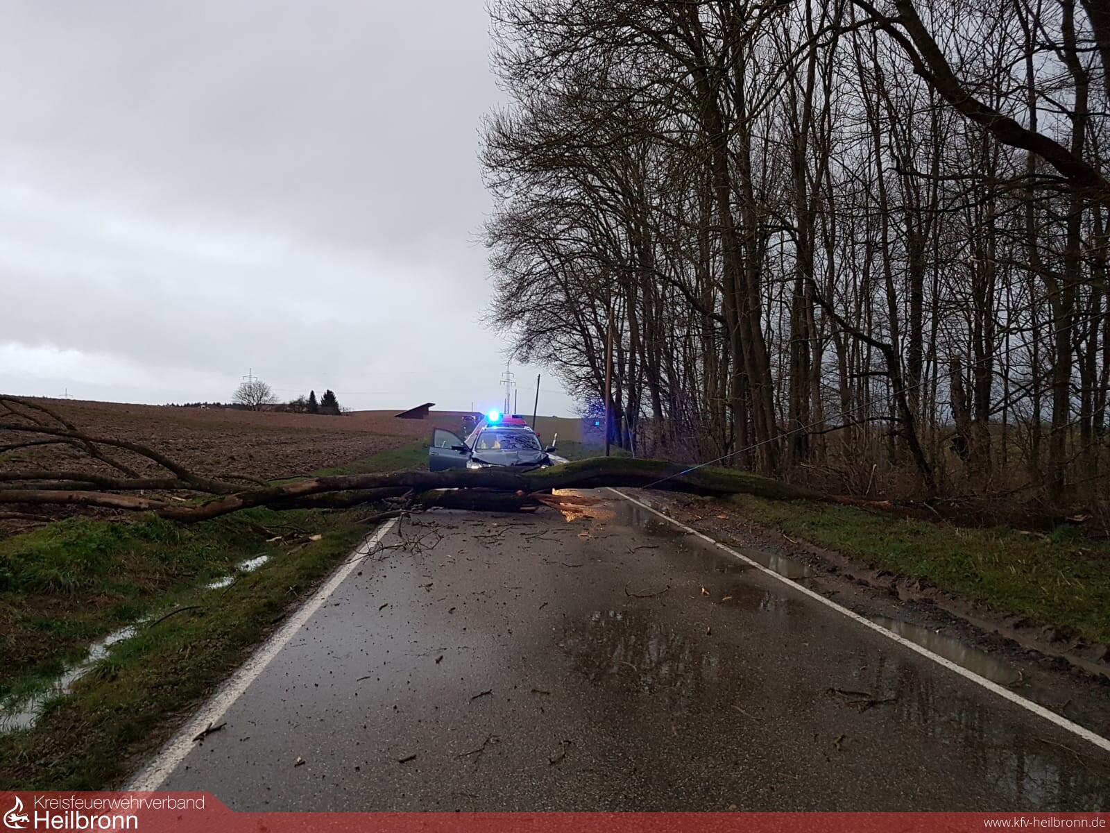 Sturmtief „Sabine“ war noch nicht richtig im Ländle angekommen, wurde die Feuerwehr Neudenau schon zum ersten Sturmschaden alarmiert. Auf Kreßbacher Gemarkung war ein Baum auf die Kreisstraße gestürzt. In Absprache mit der Straßenmeisterei wurde die Straße gesperrt.