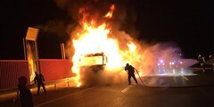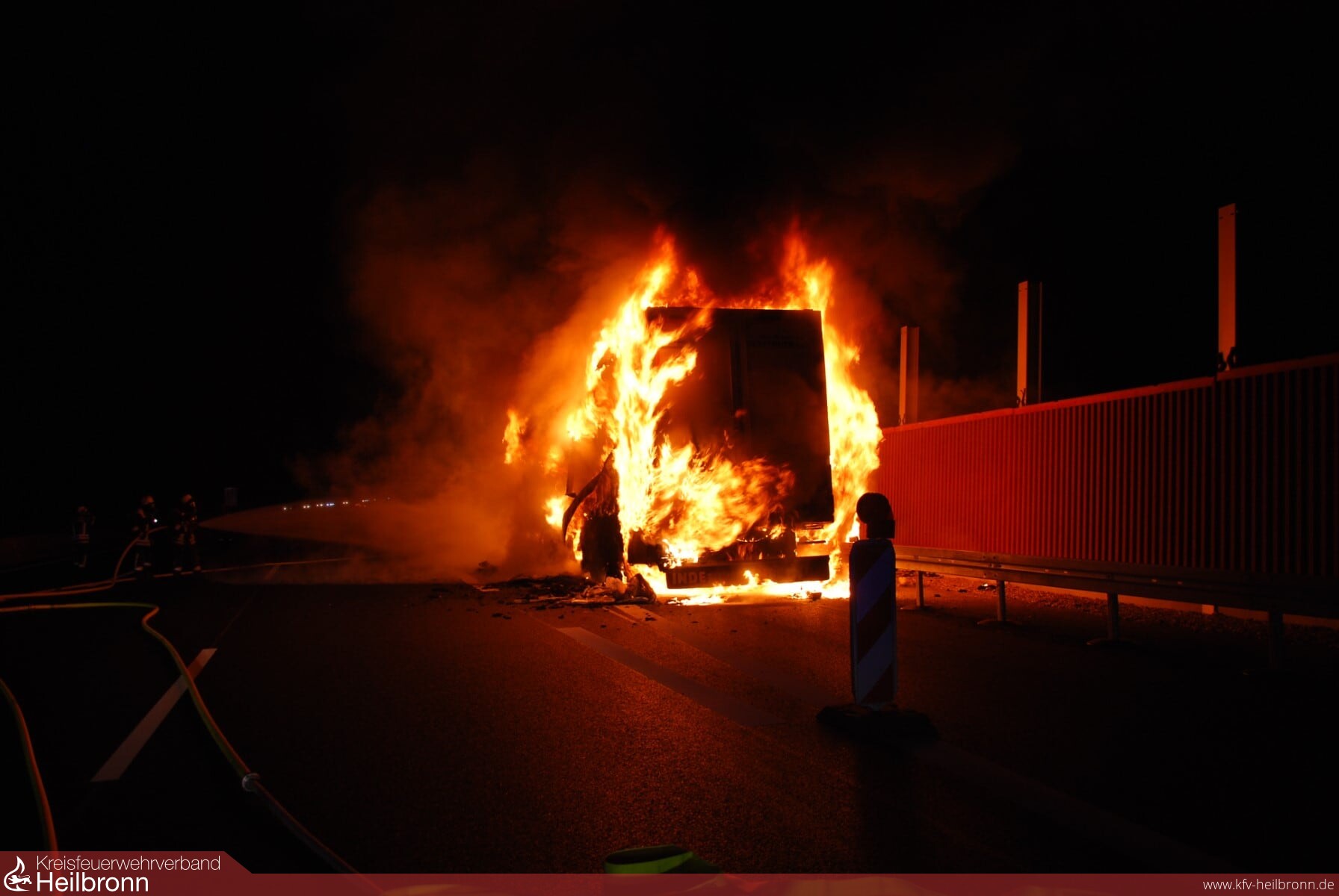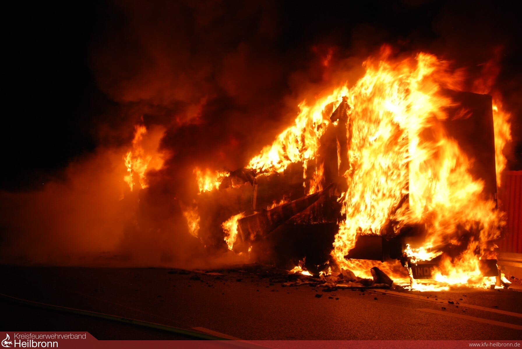 Der Fahrer eines spanischen Iveco Sattelzugs stellte am Samstag um 05.48 Uhr fest, dass es im Bereich der hinteren Reifen zu einer Rauchentwicklung kam. Nach dem Anhalten brannte bereits ein Reifen und das Feuer griff schnell auf den gesamten Auflieger über. Trotz des Löscheinsatzes der Feuerwehr brannte der mit 20 Tonnen Käse beladene Sattelzug komplett aus. Der Fahrer blieb unverletzt. Der Schaden beläuft sich ersten Angaben zufolge auf ca. 100 000 Euro. Die Richtungsfahrbahn Mannheim wurde zunächst voll gesperrt, ab 07.50 Uhr wurde ein Fahrstreifen für den Verkehr wieder freigegeben. Die Feuerwehr war mit 40 Mann und acht Fahrzeugen im Einsatz.