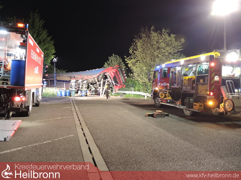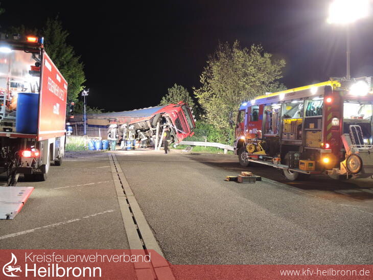 Der Mann hatte dies offenbar nicht bemerkt und fuhr weiter. Daraufhin geriet der Lkw-Anhänger in Schieflage und prallte gegen die Betonmauer. Schließlich kippte auch die Zugmaschine nach links. Zuvor konnte sich der Lkw-Lenker noch unverletzt aus der Fahrerkabine befreien. Weil der Kraftstofftank seines Sattelzugs bei der Havarie beschädigt worden war, musste die Feuerwehr, die mit vier Fahrzeugen und 13 Kräften ausgerückt war, etwa 400 Liter Diesel herauspumpen. Die weiteren Bergungsarbeiten dauerten mehrere Stunden. Die Höhe des entstandenen Sachschadens steht noch nicht fest.