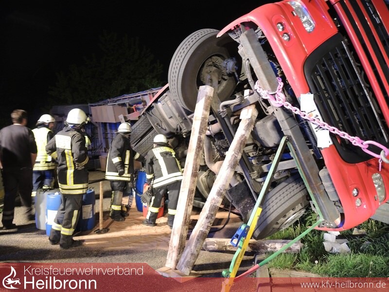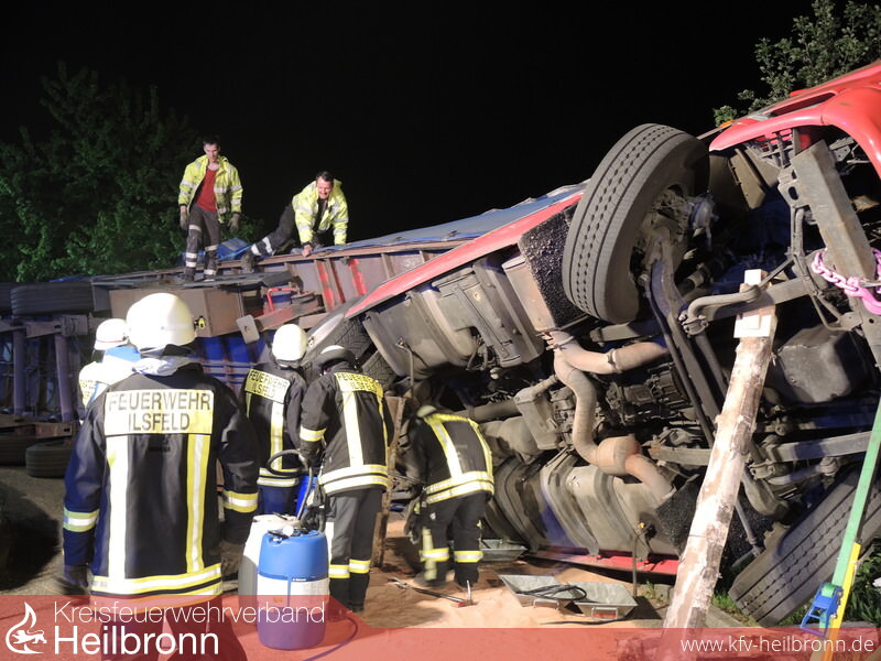 Die Feuerwehr Ilsfeld wurde mit dem Alarmstichwort „auslaufender Kraftstoff“ auf die Tank und Rastanlage Wunnenstein in Fahrtrichtung Stuttgart alarmiert. Beim Eintreffen des Kommandowagens der Feuerwehr Ilsfeld stellte sich heraus dass es sich um einen um einen mit Holzplatten beladenen umgestürzten LKW handelt.
