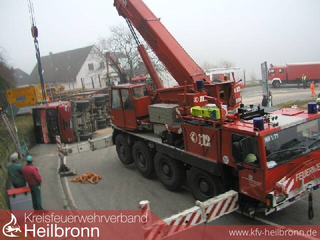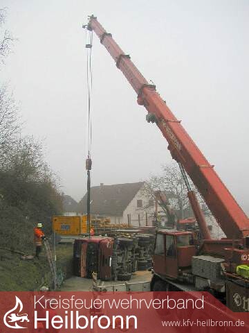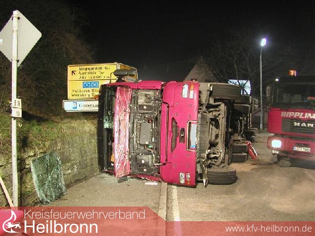 Der Fahrer konnte mit leichten Verletzungen gerettet werden. Aus dem LKW auslaufendes Öl und Dieselkraftstoff beseitigten die Feuerwehren aus Löwenstein und Weinsberg. Die Ladung des umgestürzten LKW wurde auf einen bereitgestellen Langholzzug umgeladen. Mittels Feuerwehrkran der Feuerwehr Heilbronn sowie der weiteren eingesetzten Feuerwehren konnte der verunglückte LKW aufgestellt werden.