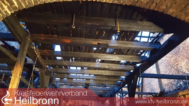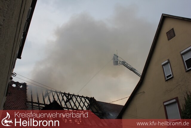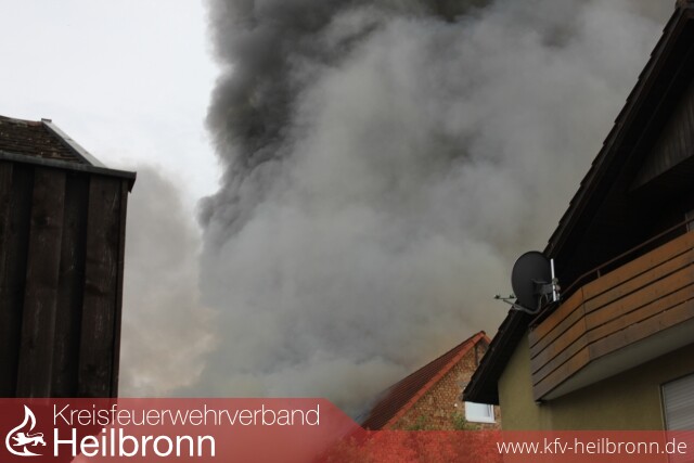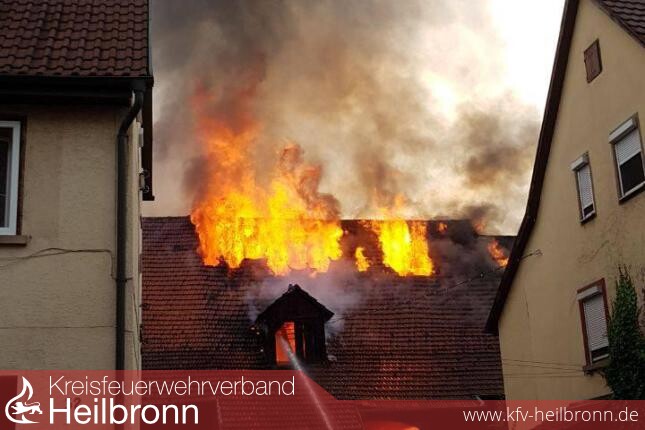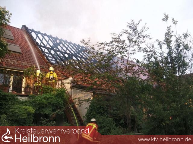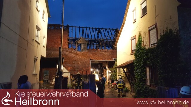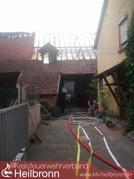 Wenige Minuten nach Alarmeingang an der Einsatzstelle eingetroffen, veranlasste der Einsatzleiter nach der ersten Erkundung und einem offenen Dachstockbrand einer Scheune, sofort die Nachforderung eines weiteren Löschzuges der Berufsfeuerwehr Heilbronn. Kräfte der Feuerwehr Neckarwestheim, boten sich mit einem besetzten HLF ebenfalls zur Unterstützung an.