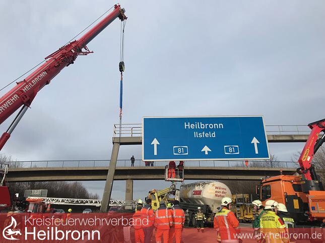 Bei einem Unfall auf der A81 bei Mundelsheim sind am Freitagvormittag vier Menschen schwer verletzt worden. Stark beschädigt wurde außerdem eine Schilderbrücke. Eine Spezialfirma aus Gaggenau baute sie ab. Die Autobahn in Richtung Heilbronn war bis 19.15 Uhr gesperrt. Auf der Umleitungsstrecke brauchten Autofahrer enorm viel Geduld. Sie kamen nur äußerst schleppend voran. Der Fahrer eines Sattelzuges mit Silo-Auflieger ist laut Polizei gegen 10.20 Uhr auf dem rechten Fahrstreifen zwischen den Anschlussstellen Pleidelsheim und Mundelsheim unterwegs. Als er auf den vorausfahrenden Lkw auffährt, zieht er nach links. Der Sattelzug stellt sich quer und prallt gegen den Pfeiler einer Schilderbrücke. Außerdem drückt er den BMW einer Autofahrerin gegen die Mittelleitplanke. Die Fahrerin eines nachfolgenden VW Golf prallt gegen den querstehenden Silo-Auflieger und ihr Auto verkeilt sich am Unterfahrschutz. Bei dem Crash wird die Schilderbrücke derart beschädigt, dass die gesamte Konstruktion auf die Unglücksstelle, die Verletzten und die Rettungskräfte abzustürzen droht. Die Berufsfeuerwehr Heilbronn eilt nach Angaben von Zugführer Kai Lindheimer mit zehn Männern und einem Kran zur Unfallstelle und sichert das Bauwerk ab. Spannweite Mit sechs Mitarbeitern kommt die Spezialfirma Swarco Dambach aus Gaggenau vor Ort. Ihre Aufgabe: die Demontage der beschädigten Schilderbrücke. Diese besitzt eine Spannweite von etwa 20 Metern über die Fahrbahn, sagt Oberbauleiter Herbert Lazar. Die Gesamtfläche der Schilder umfasse etwa 50 Quadratmeter. Obwohl zeitintensiv, sei der Abbau der Anlage aber keine knifflige Aufgabe. Zunächst montieren die Mitarbeiter die beiden Hinweistafeln ab. Im nächsten Schritt wird der Querriegel, an dem die Hinweistafeln befestigt werden, abgebaut. Sein Gewicht: etwa zwei bis zweieinhalb Tonnen. Zum Schluss kommen die beiden Pfeiler an die Reihe, erklärt Lazar das Vorgehen. Der linke sei durch den Aufprall des Lastwagens so beschädigt und verzogen, dass sich die Schrauben im Boden nicht lösen lassen. Die Fachleute schneiden den Pfeiler in Bodennähe mit einem Winkelschleifer ab. Pendler Marcus Krämer aus Heilbronn ist der Geschäftsführer von Swarco. Die Firma beschäftigt 165 Mitarbeiter und hat einen Vertrag mit dem Regierungspräsidium (RP) Stuttgart abgeschlossen. Swarco ist für derartige Demontagen von Schilderbrücken im Bereich des RP zuständig, wenn diese so wie bei diesem Unfall beschädigt werden. Etwa 20 derartige Einsätze im Jahr absolviert die Firma auf Autobahnen und Landstraßen. Krämers Firma baut Schilderbrücken. Dass für die Konstruktion Aluminium und kein Stahl verwendet worden sei, habe dem Lkw-Fahrer womöglich das Leben gerettet, meint Krämer. Der Unfall und seine Folgen verlangen Autofahrern in Fahrtrichtung Heilbronn viel Geduld ab. Sie werden an der Anschlussstelle Pleidelsheim ausgeleitet. Stoßstange an Stoßstange quälen sie sich durch die umliegenden Orte. Einen längeren Stau gibt es auch in Fahrtrichtung Stuttgart, weil auf Höhe der Unfallstelle Teile der Gegenfahrbahn für die Bergungsarbeiten gesperrt sind. Nach Angaben von Andy Dorroch, Kreisbrandmeister in Ludwigsburg, sind etwa 50 Angehörige der Feuerwehren aus Pleidelsheim, Murr, Marbach, Großbottwar und Heilbronn im Einsatz. Nun muss bei Mundelsheim eine neue Schilderbrücke aufgebaut werden. Kosten: etwa 120 000 Euro.
