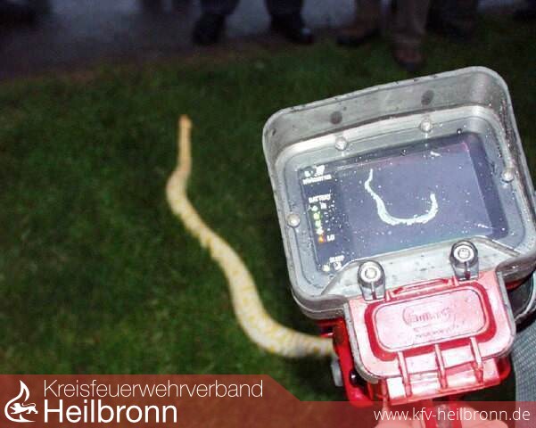 Beim Elsenzer Badesee wurde seit mehreren Tagen eine ca. 2 m lange Baumpython gesucht. Da das Tier tagsüber Wärme aufnimmt und somit am Abend wärmer bleibt als die Umgebung, wurde das Gelände um den Badesee mit der Wärmebildkamera abgesucht. Trotz intensiver Bemühungen musste die Suche erfolglos abgebrochen werden.