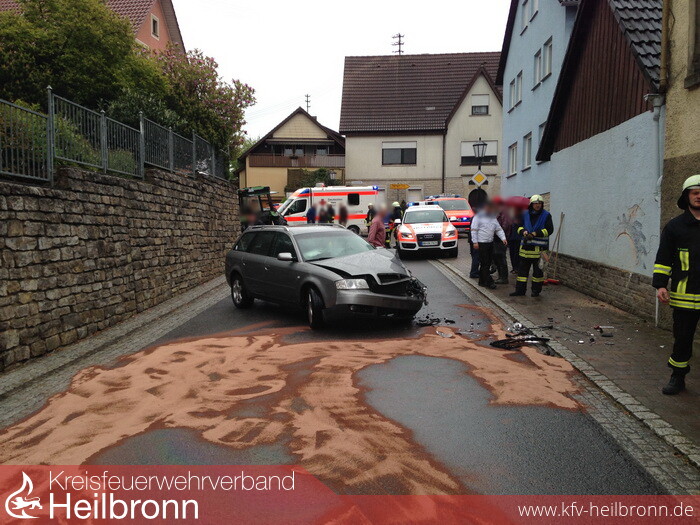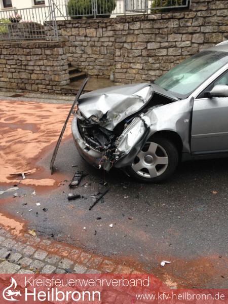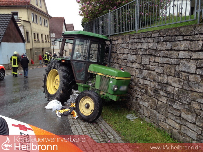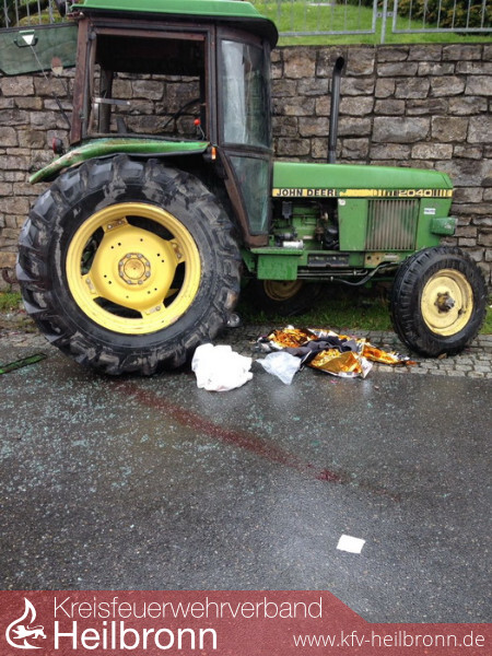 Ein Schlepper war mit einem PKW frontal kollidiert. Hierbei wurde der Schlepper zunächst gegen eine Garagenwand geworfen, durch das vermutlich eingelegte Standgas machte sich der Schlepper weiter selbständig und prallte nach ca. 20 Meter auf eine Stützmauer wo er zum stehen kam. Der junge Fahrer zog sich hierbei schwerste Verletzungen zu, er wurde von den Einsatzkräften aus der Fahrerkabine gerettet. Weiterhin sicherte die Feuerwehr die Unfallstelle ab, nahm die auslaufenden Flüssigkeiten an PKW und Schlepper auf, streute die verunreinigte Fahrbahn mit Ölbinder ab und reinigte diese.